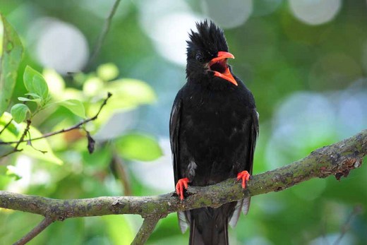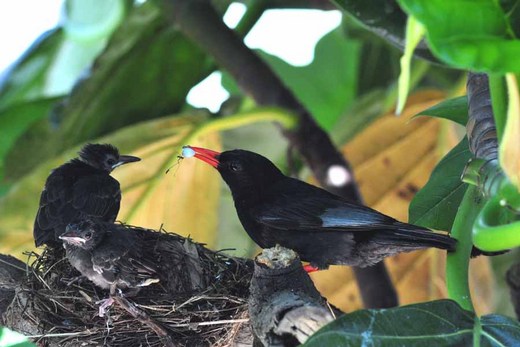 繁殖季枝頭和電線桿,傳來溫柔的喵瞄聲,是紅嘴黑鵯給人的第一印象。牠的生活領域,普及於台灣之中低海拔山坡地,及林緣地帶,大面積的荒野平地等。食物方面,根據成鳥餵食時的食物觀察,草蟬、薄殼小螺、蜻蜓等皆為範圍。 六月,紅嘴黑鵯繁殖育雛期間,成熟親鳥展現堅毅、勇敢的本性,與最被傳說的大卷尾、烏秋,趕人護雛的形象相比,毫不遜色。觀察中,幾次大型的樹鵲企圖接近鳥巢區,雌雄親鳥立即合手強力出擊,打得體型較大的樹鵲落荒而逃。 在哺育雛鳥方面,雌雄成鳥輪番進行,且在每一次餵食後,於巢邊等待雛鳥排出糞便。雛鳥近白色的糞便,由一層薄膜包覆著,成鳥不是丟棄,似乎當作食物,及時吞食入腹。在等待雛鳥消化的成鳥,不時摇頭觀察雛鳥,「最新產品」排出。 對一般休閒來說,由純賞鳥轉進影像紀錄,起初大多數紀錄的經常是本地最常見的鳥種。什麼白頭翁、小白鷺、麻雀、珠頸斑鳩、大卷尾等的。其實,如果有機會深入、長時的觀察,不急著補進高檔裝備,當個發現新大陸的菜鳥也不錯。