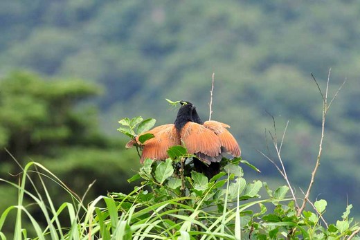 觀察生活在同樣領域的番鵑發現,個體停棲位置很固定,生活中,經常密集地回應同類呼喚。不過卻更常獨佔枝頭,各自理毛。番鵑食物遍及各類昆蟲和小動物,舉凡青蛙、變色蜥蜴、螳螂、蜈蚣、飛蛾等昆蟲,都曾是日常的菜色內容。 「那次有代價的交配」過程中,先是黑瘦的雄鳥,在雌鳥呼喚下,從遠方飛近至雌鳥邊枝頭。約在20秒停留,再轉身沒入草叢捕取獵物。現身時雄鳥口啣螳螂,立即飛靠雌鳥,搏身交配,事後及時交出所獲,雄鵑飛離枝頭,雌鵑享用代價。 此次對番鵑小範圍的觀察,窺見其生活環境、覓食類型、求偶等的過程。其中以末段的繁殖交配項目最覺特別。不過試著推想,野生動物類屬之求偶交配中,或許覓食能力高低,是雌性野生動物個體在演化內,對異性之首要門檻條件吧! 雌鵑成鳥有獨立覓食能力,但也許與其他野生動物類似,交配前還有基因考量。不過,交媾前看表現,事後即付訖,番鵑這樣的門檻代價,還真令人類驚嘆!