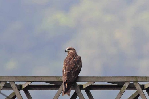 黑鳶老大佔據這片山谷河灣,即使在用餐完畢後的午前時段,一兩隻等待氣流上升,通常較晚出門的大冠鷲,碰見飛行俐落的黑鳶老大,也得盤旋高處,尊敬幾分。就飛行俐落的黑鳶來說,車站前的電桿是牠們的寶座,電和車來去算什麼。 有進有出,生物鏈中黑鳶老大的排遺,如果昨夜水流沒有沖走,粉蝶群會引為一頓大餐,爭相競食。飽足的粉蝶,說不定在奔波的路上,就淪為其他鳥類的點心。 黑鳶老大不在乎粉蝶怎樣個生存方式,但是任何在牠狩獵河灣區的鳥族動靜,牠可是歷歷在目中。或許人類太久以來都很「仁慈和節制」,黑鳶老大對拿著「物件」瞄準牠的取景者,也不時來個示威,沒嚇著人,倒是頻頻讓取景畫面破格。 |