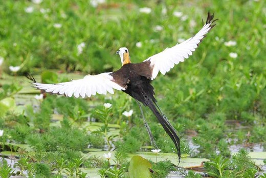 6~7月是菱角田初長的時刻,也是台灣水雉求偶和繁殖的季節,成熟的雌雄水雉,灰姑娘般的冬羽,這時候都換成華麗的羽色。冬季默默行走水面,和專致吃食的舉動,也被聒噪、呼嘯和飛翔示警的行為所取代。 看水雉飛翔的姿態最美,牠們為驅異類敵鳥、驅逐同類個鳥、求偶爭交配權、移動覓食區等而飛行。還有一種狀態時,水雉也會如飛行動作般,張口舞爪。那就是抱卵巢附近,和保護幼雛覓食範圍內的安全時,其熱切和急迫的樣子,與爭取交配權時相較,毫不遜色。 由於有著長長的尾羽飾毛,和草綠色的腳趾和爪,起身飛躍和即將停棲時的動作,可以說是水雉最美的時候,與冬季時短而便捷的身形繁複許多,或許這也是這種動物繁衍的代價。 |