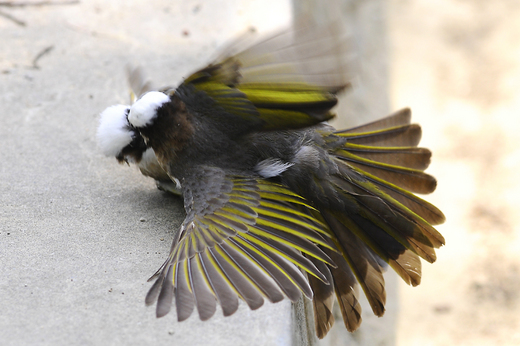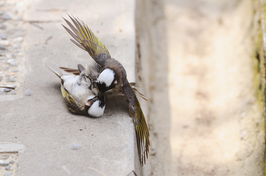 白頭翁,台灣普遍的留鳥,印象中可能是溫和的,只是好動、好奇,說凶狠的樣貌似乎想不到。說平常不明確,但在繁殖季的四五月,我看到的,至少就不是這樣子。 清晨在野外,郊區甚至是平常的居家附近,仔細聆聽,天將破曉之際,通常第一陣鳥聲,大多由白頭翁的鳴叫開始的。牠們活躍好動,也融入人的社會生活型態中,真是台灣普及的特有亞種鳥類。 繁殖季的白頭翁,不只群族內為食物、為愛之權爭的你死我活,對不小心闖入領域,也是為愛尋草、尋枝的大卷尾,白頭翁對大卷尾可是毫不遲疑的展開攻擊呢! 圖中,這兩隻為愛打的你死我活的傢伙,這個上午已經第三次了,就在我守候和拍攝鳥景兩公尺內幹架。不誇張,兩個傢伙毫不緊張,幾乎就要滾到腳架下了。 好笑的是,牠們狠狠打架之間,其中一隻,還起身,氣呼呼地驅趕一隻倒楣的大卷尾,牠正以嘴巴拔草,準備回去築巢。而驅趕的方式像及了大卷尾騎在大冠鷲頭上一樣,好個凶狠樣貌。
