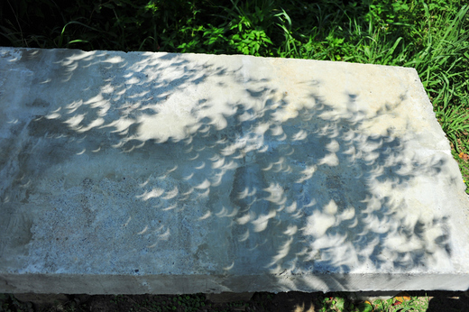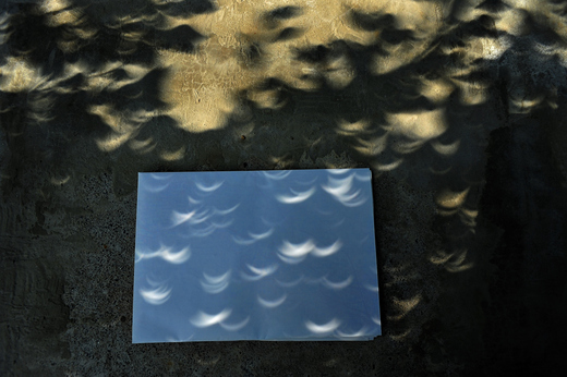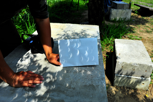 本來就想用最簡單的方式來觀察今天的日食景觀,故只有拿出幾張便條紙,簡單戳幾個小圓洞,讓日光投射在另一張紙上,以安全的觀看。不同的戳孔排列,形成不同的日頭布陣,倒也好看。 不過,人工戳孔所排列的日影,終究沒有自然的樹蔭穿孔來的多樣,日食光線,透過我們背後的大榕樹,直洩在地上、水泥板上的景觀變換莫測,成為今日觀景最奇妙的經驗。 在沒有器材和適當材料的時代,是怎麼觀測日食的,我不知道,但是原來每天穿投在地板上的成片日光,在日食的時候,也同樣是天空中日食的樣貌。大樹下,日食天色昏暗中氣氛中,或許曾傳遞更多的日食神話。觀日食,我們在大樹下,達陣。