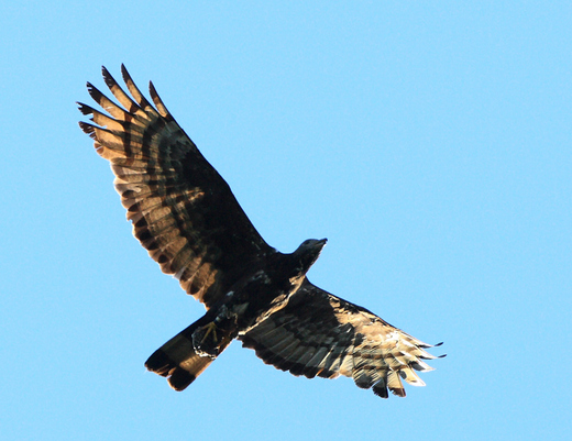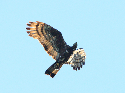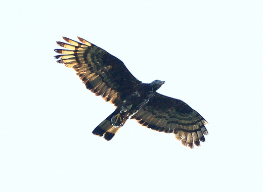 這回雖然不是就某個蜂巢進食的蜂鷹,但是這隻腳戴識別環(我稱它為腳鐐)的個體,由北往南,高空中飛過之時,剛好被鳥類攝影高手,連大兄逮個正著。經入載大螢幕檢視,兩人欣喜的發現,足戴的「腳鐐」,在右腳,由上到下應是白和藍兩節。初步判斷,很可能是某家研究的個體,究竟是國內還是他國?有待解開。 此回發現時間為上午7時5分,發現人連大兄,基隆河某谷地上恐。更值得參考的資訊是,該隻蜂鷹爪上還抓住一塊類似蜂窩殘塊的物件,如果判斷不差,該個體應該是在附近覓食。抓食物「回家」的可能性若存在,那麼很有可能是在台灣北部地區繁殖或育雛的小族群了。 據連大兄之後回想,本週二(7月28日)同樣在早上,他也在遠距離的觀察中,看見一隻蜂鷹。據個人經驗,兩相對照下,很有可能是同一小族群的個體。 在準備處理這張腳戴「腳鐐」蜂鷹資料上傳之今天,上午我和連大兄,又偷閒到基隆河更深的谷區,目的在探視可能的老鷹交配育雛形態。很偶然的又發現兩隻蜂鷹同時在山頭出現,兩隻都是淡色型的個體,只可惜太遠,影像難以辨識是否有「腳鐐」。 由於上午(約9時30分)距離昨日發現之處,直線距離約在5公里左右,我們認為,不能排除是同一小族群。年初和最近持續的發現,對我來說已算是幸運的賞鳥人。而且,連大兄在本次的「抓鳥」中,結果還在可見的距離內,看見識別環,真是高桿。他特別交代,將此回粗略過程公開,希望內行的研究者能據以參酌。