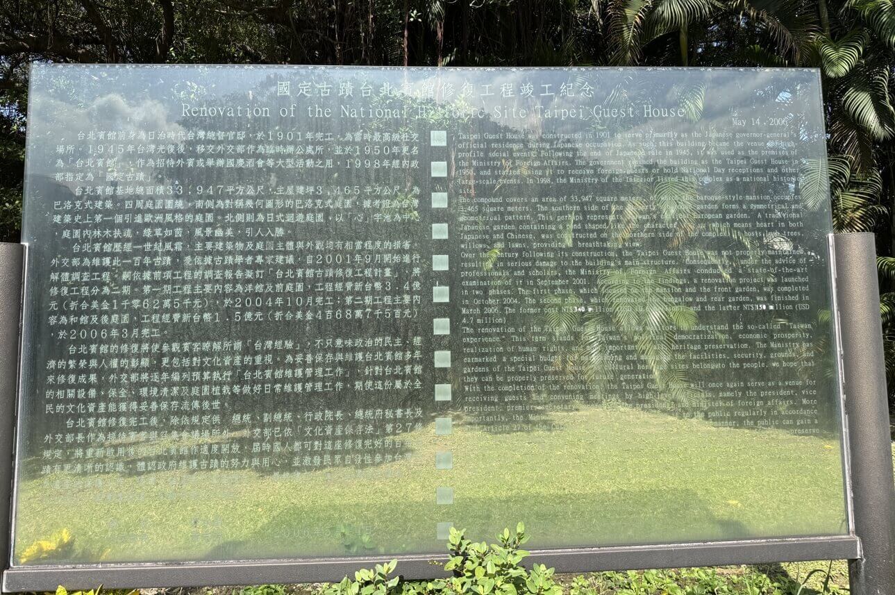 台北賓館從日本時代的台灣總督官邸,到近代成為接待國內外貴賓的重要場所,極具歷史意義。既懷舊歷史場景,也可欣賞建築之美,更具休閒遊憩之附加價值,非常值得利用每個月難得的開放日子前來一遊。