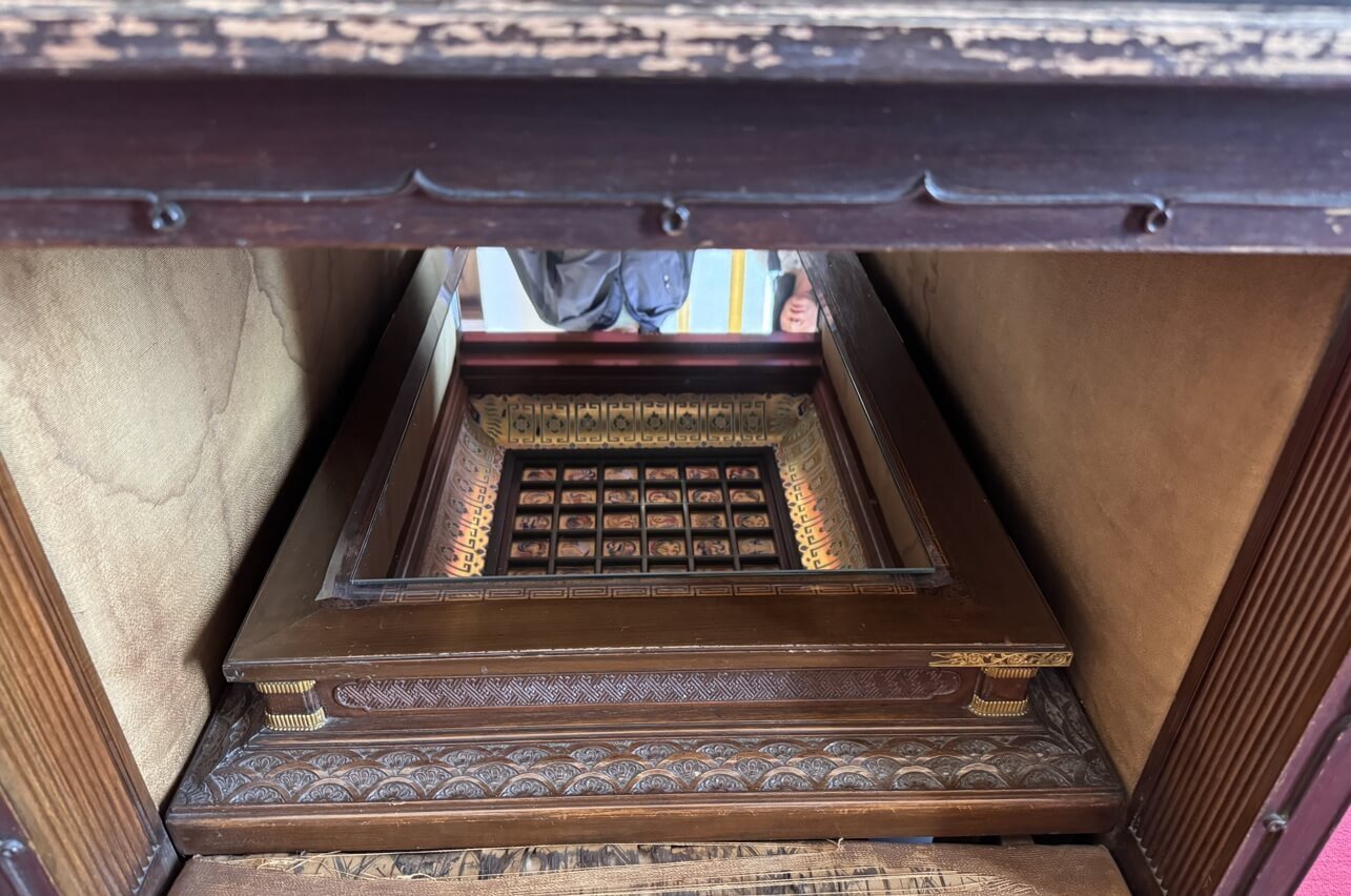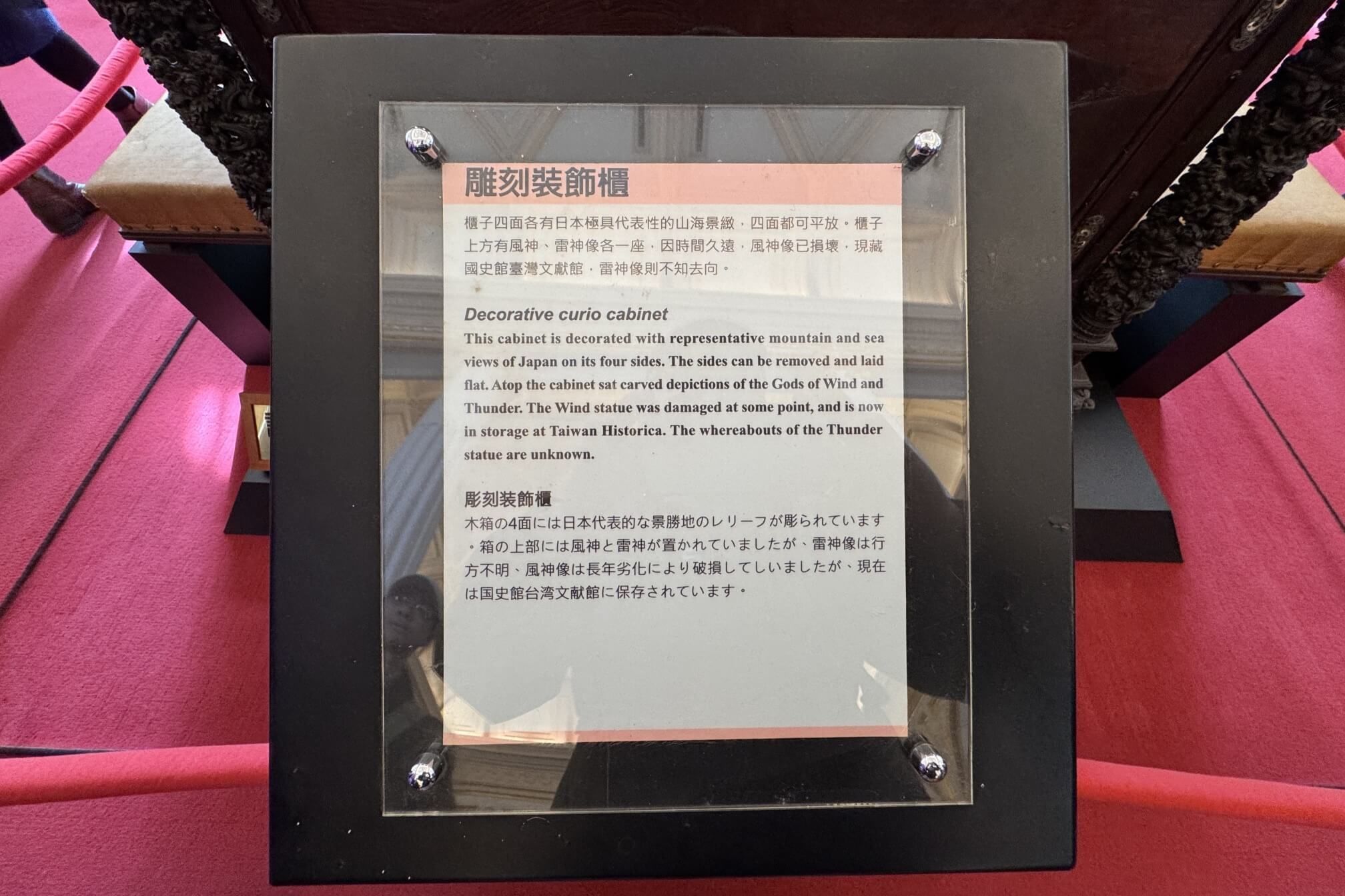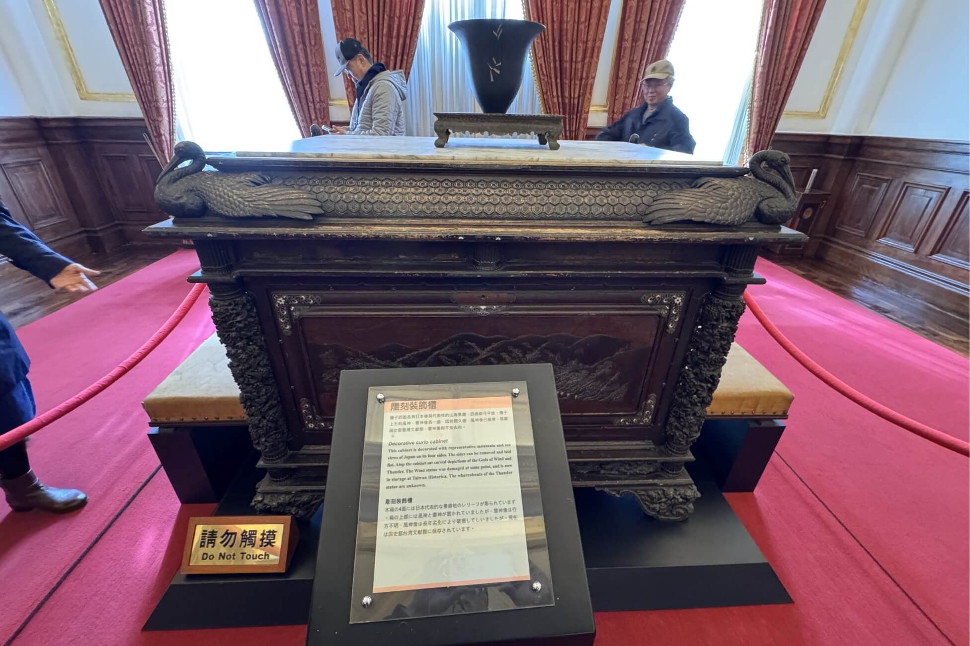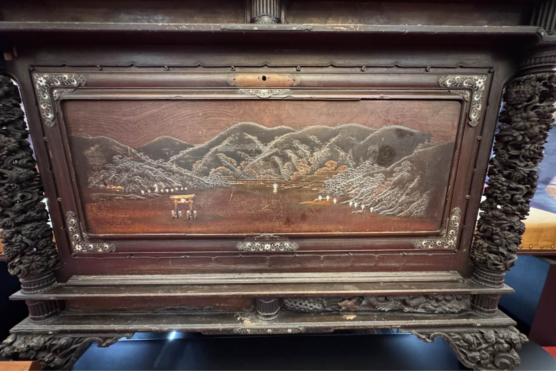 ↓這座雕刻裝飾櫃,四面都有日本極具特色的山海景緻,四面都可平放。櫃子上方原本有風神、雷神像各一座,風神像目前存於國史館,雷神像則不知去向。
