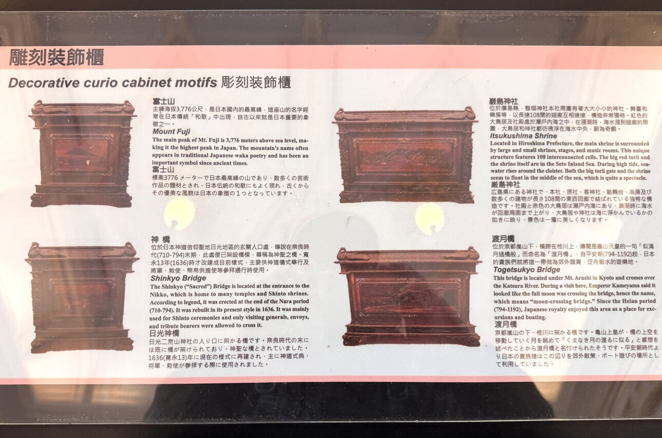↓這是雕刻裝飾櫃四面雕繪的介紹,除了正面與背面的巖島神社與渡月橋外,左右兩側面所雕繪的,分別是日本重要象徵的「富士山」及日光地區的「神橋」。
