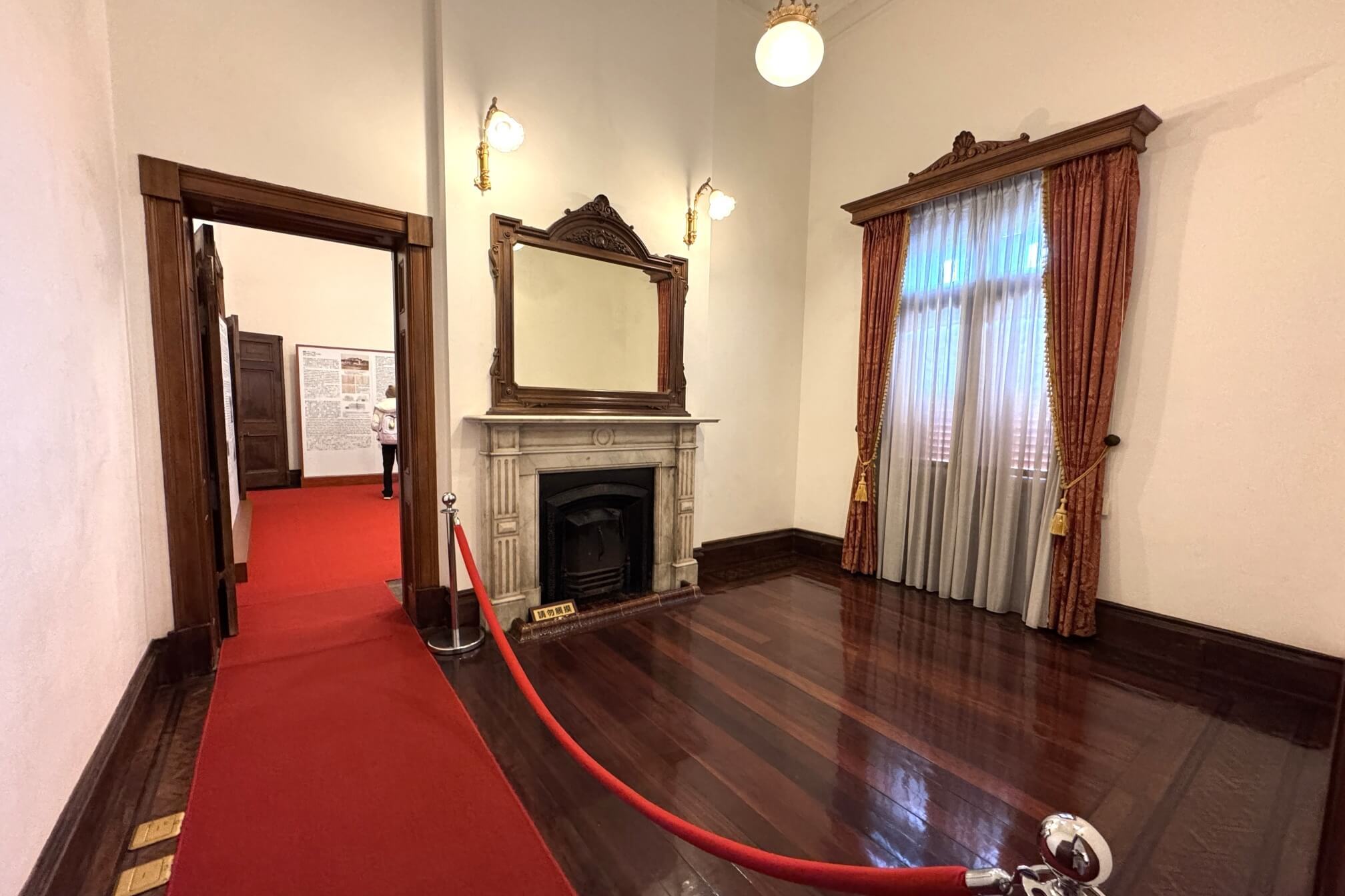 ↓進到第一間房間。當年二十世紀初建造台灣總督官邸時,因應當時台北平地冬天嚴寒而建有壁爐;結構上與後側相鄰房間的壁爐,乃共用一座排煙煙囪。