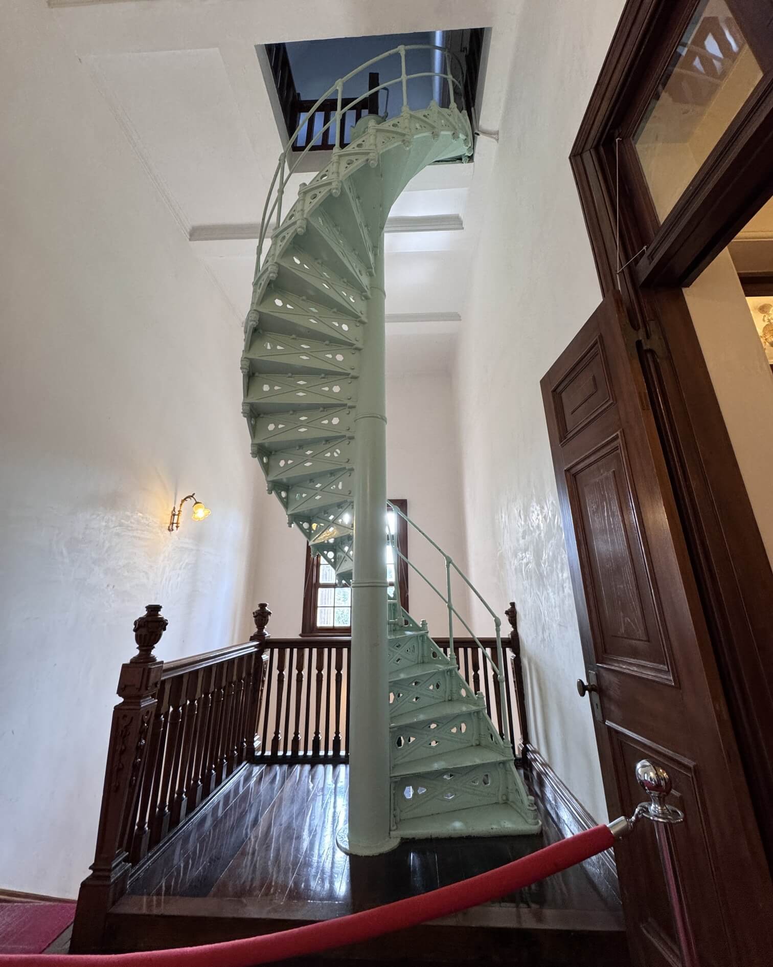 ↓側邊樓梯間,有一座螺旋狀的鐵梯,當年日本皇太子裕仁視察台灣時,就是從這裡爬上六角塔樓的三樓陽台,留下了歷史的一頁。