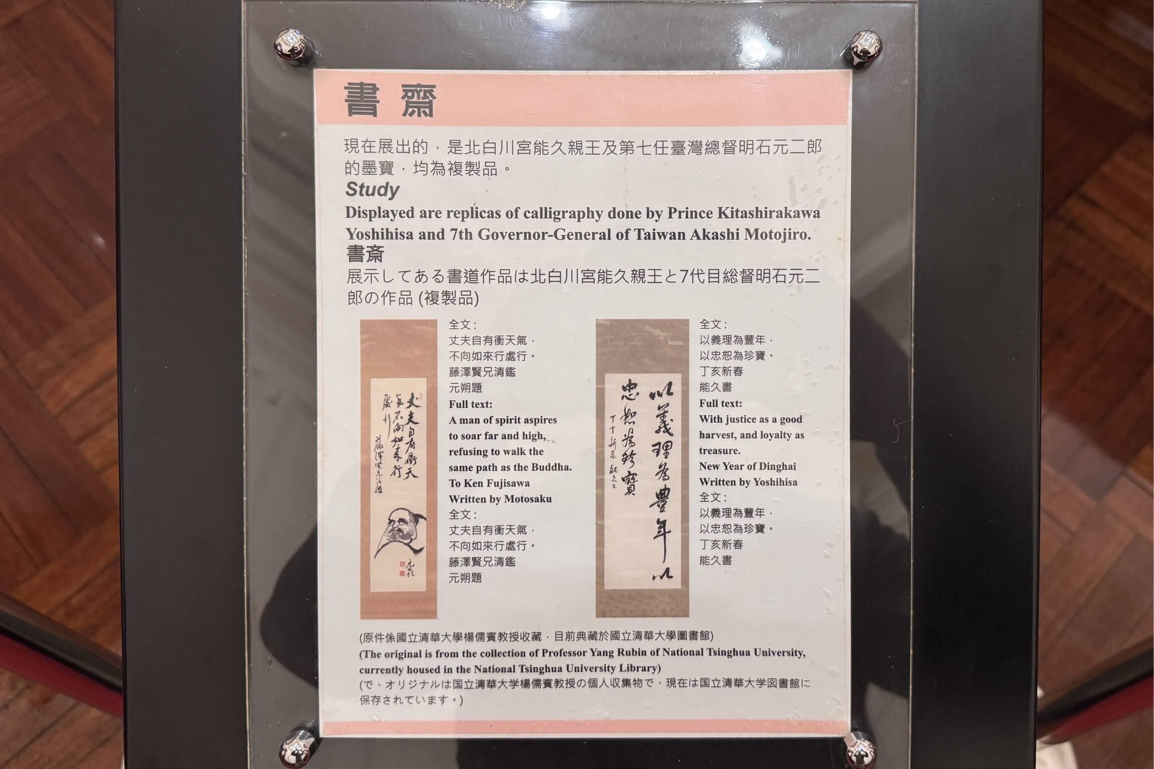 ↓牆上掛的墨寶,是日本北白川宮能久親王及第七任總督明石元二郎的墨寶,不過,所掛皆為複製品,原作目前典藏於清華大學圖書館。