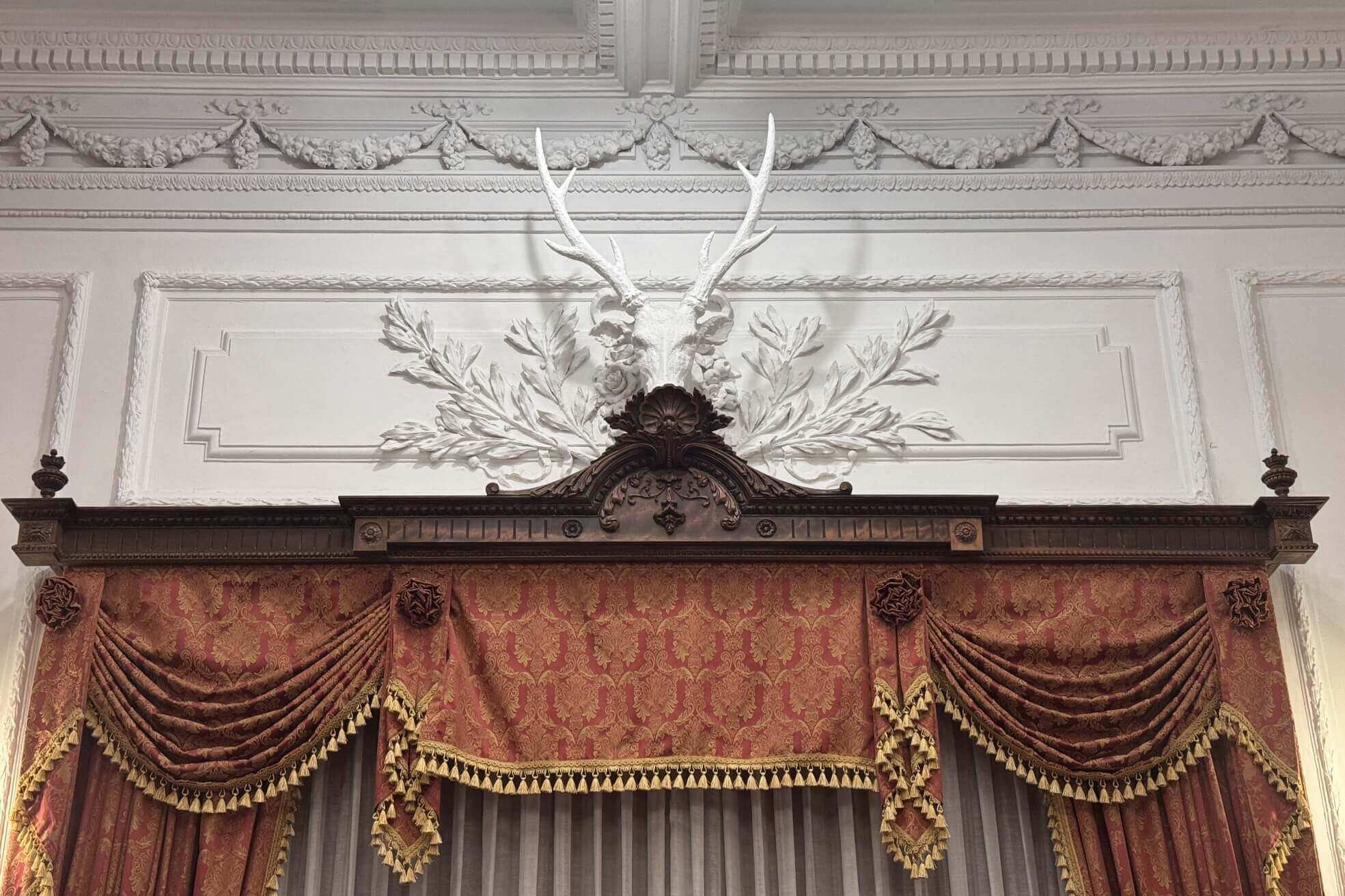 ↓門楣上,有用灰泥雕塑的梅花鹿頭。梅花鹿是台灣特有的動物,用來當作裝飾,顯示其對台灣的重要性。