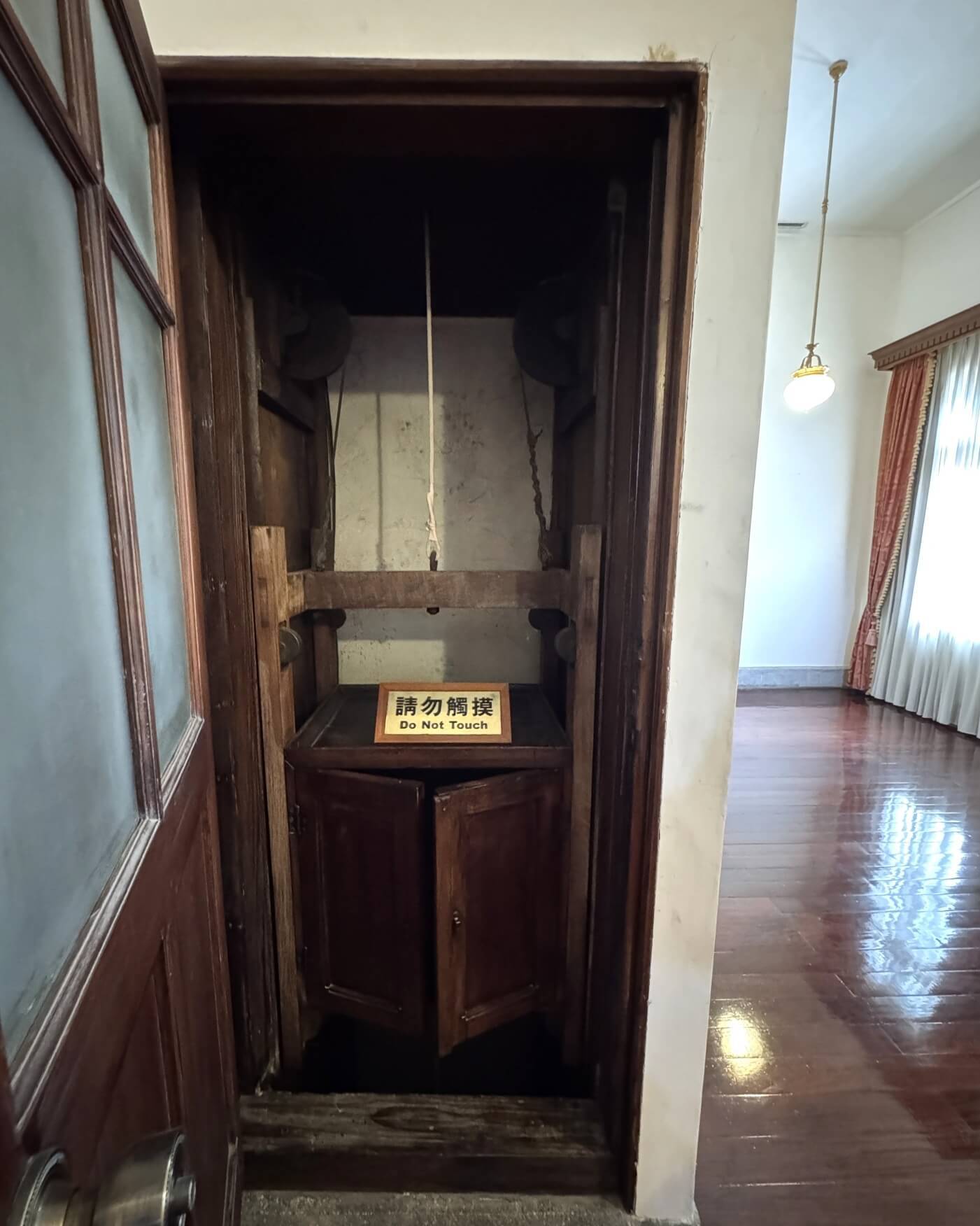 ↓這間小梯間,是將各式菜餚在一樓廚房烹飪後,透過輸送梯送到二樓的配膳室,經重新檢視、調理並裝盤後,才送到早餐室,供貴賓們食用。