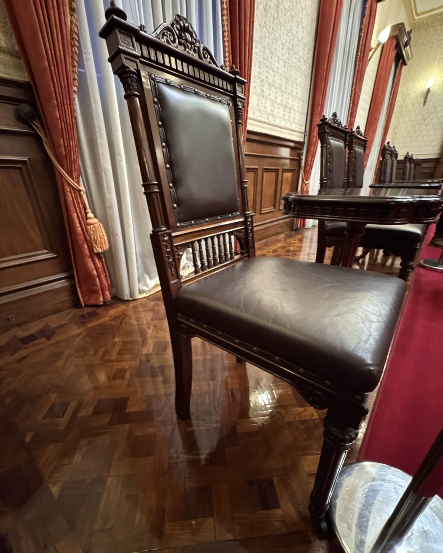 ↓這些木椅最特別的,是四隻腳中的前面兩腳,都掛著輪子。依照導覽人員的解說,這是為了過去國家重要慶典時,給來參加的黨國大老所使用的。