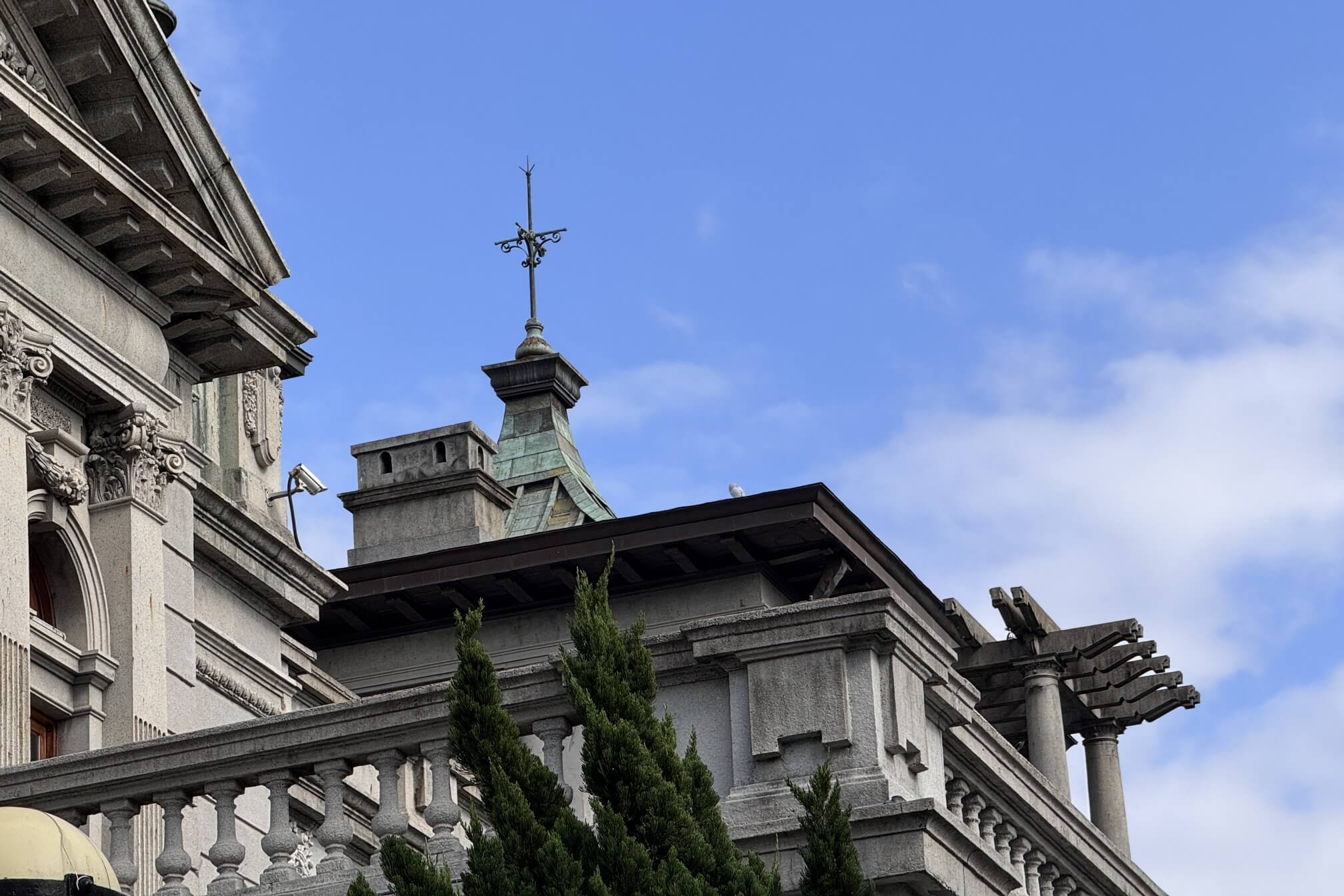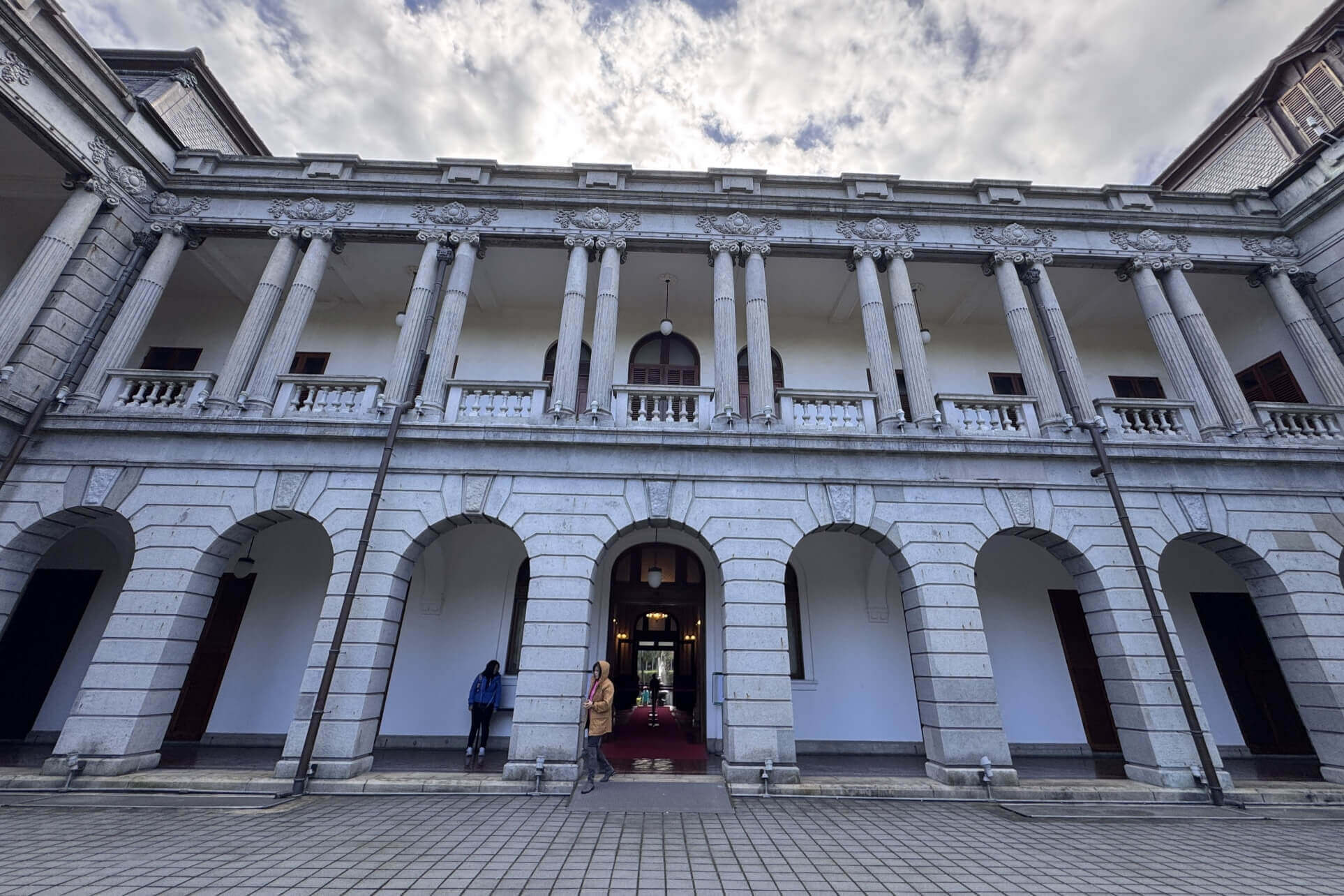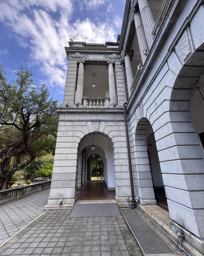 ↓主建築二樓廊道的立柱為『羅馬雙柱』,這是1913年改建時改造的(原本為單柱)。右側這一棟六角塔樓,有三樓陽台,1923年日本皇太子裕仁視察台灣時,曾在此俯瞰台北城(當時還沒太多的高樓大廈),並接受附近民眾的歡呼。