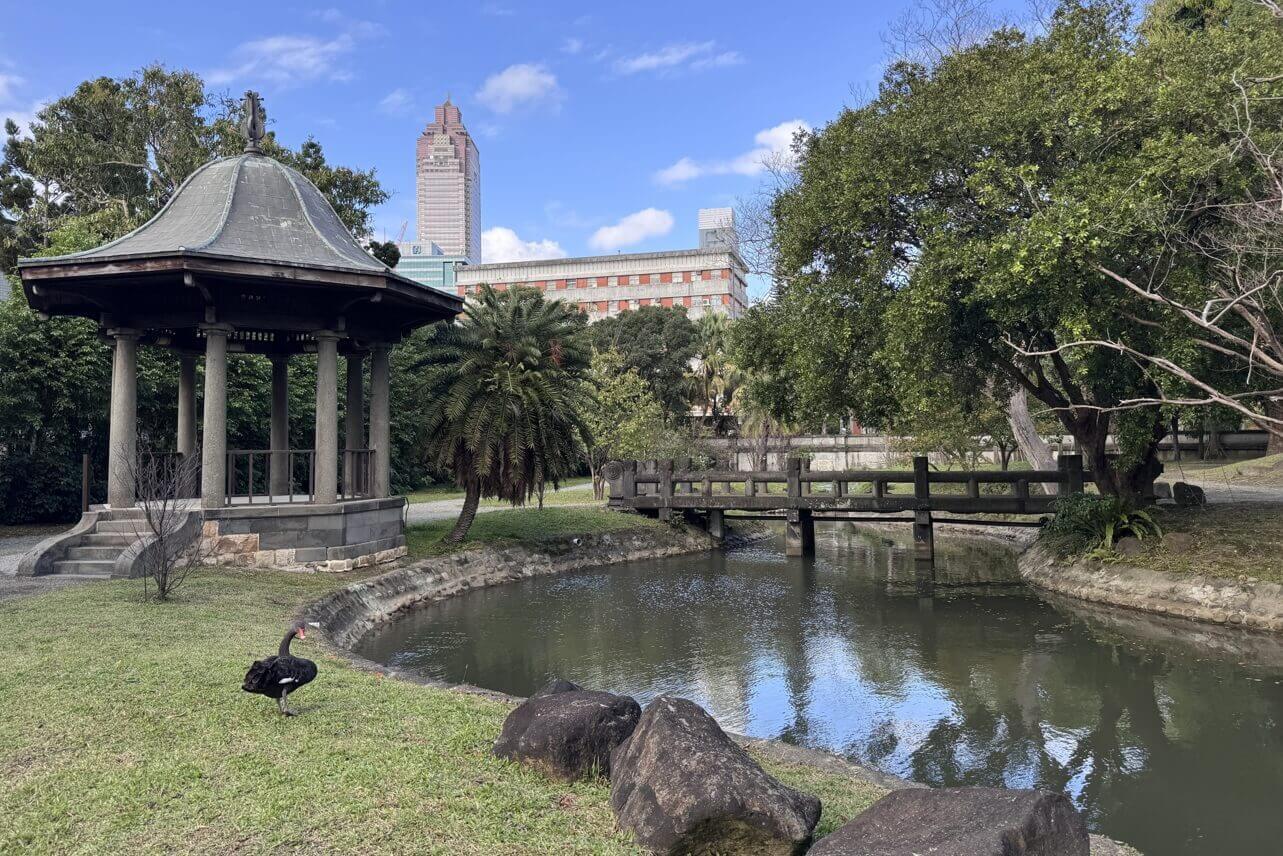 ↓池塘邊有數隻黑天鵝守護著庭園,也因為草坪未開放進入,且黑天鵝習性未明,遠觀即可。