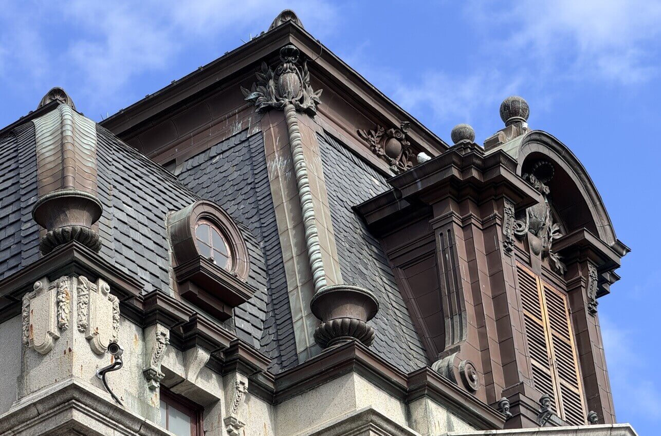 ↓主建築正面,有『馬薩式屋頂Mansard Roof』,屋頂上有「老虎窗」;牆面上有圓拱窗及陽台。