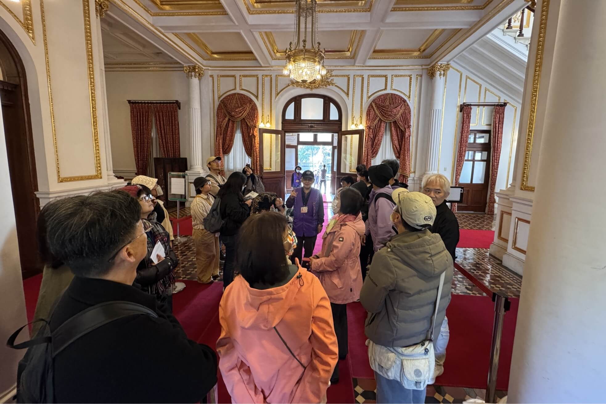 ↓導覽老師在一樓大廳向大家解說。也因為怕太多遊客同時站在同一塊區域,會對古蹟造成負擔,導覽行程便只帶到一樓的建築部份而未上樓。