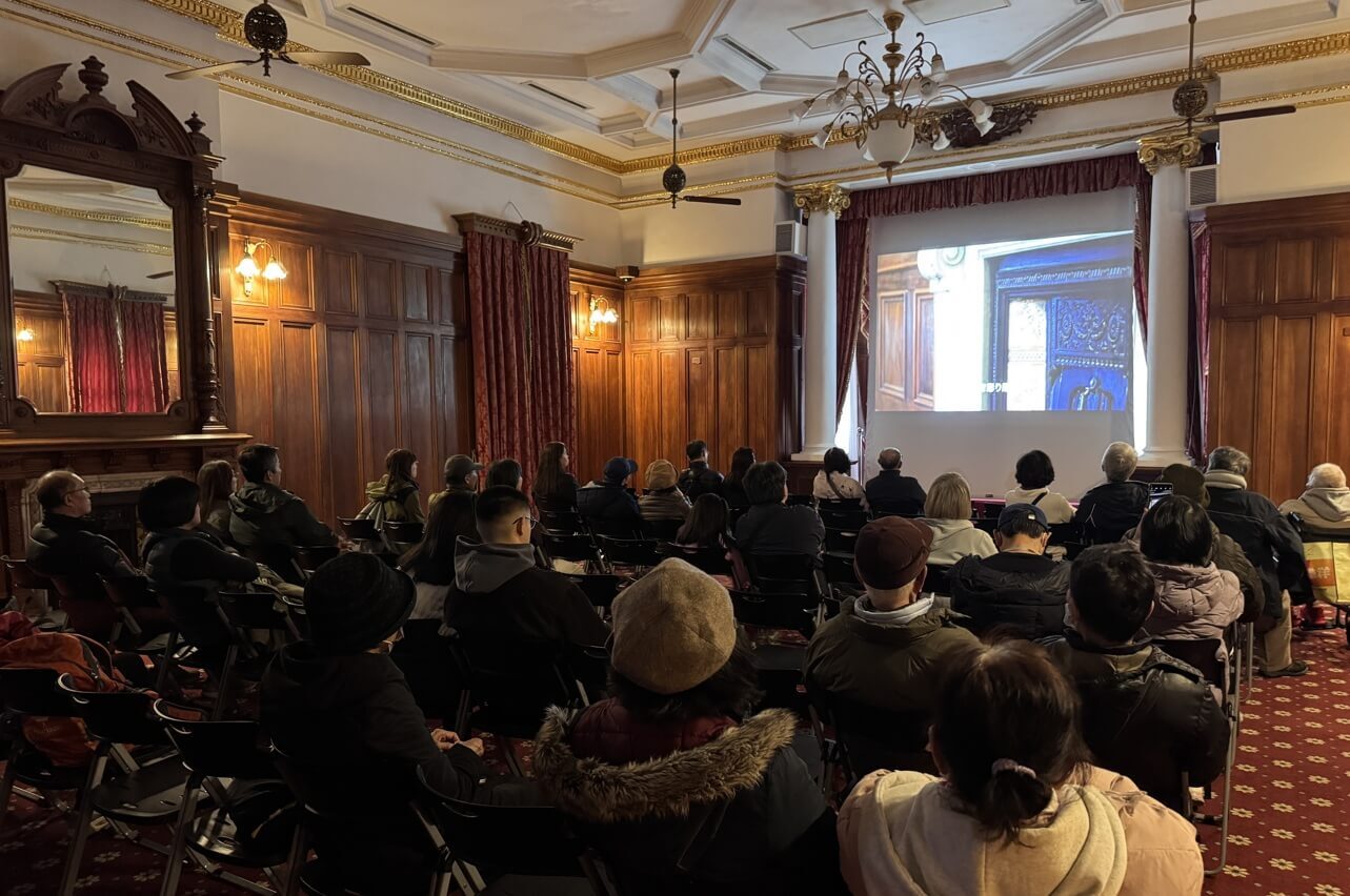 ↓導覽老師帶大家到影片播放室,這間是台北賓館的官方宴客室,許多酒會、國宴都在這裡舉辦。