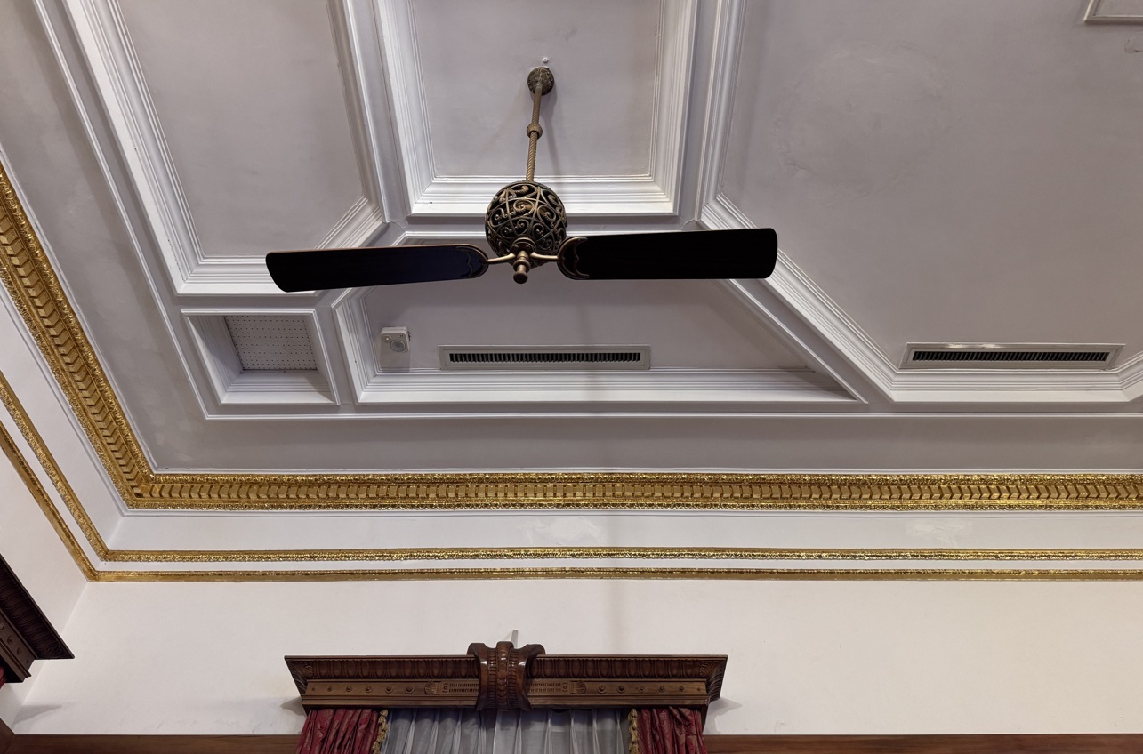 ↓導覽老師利用兩場影片播放間的空檔,介紹了這間宴客室特別的地方。首先,是頭上只有兩片葉扇的電風扇(一般至少三片),這可能是獨一無二的電風扇。
