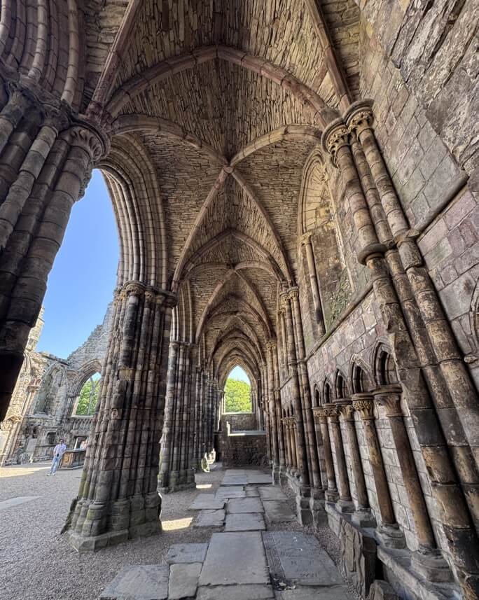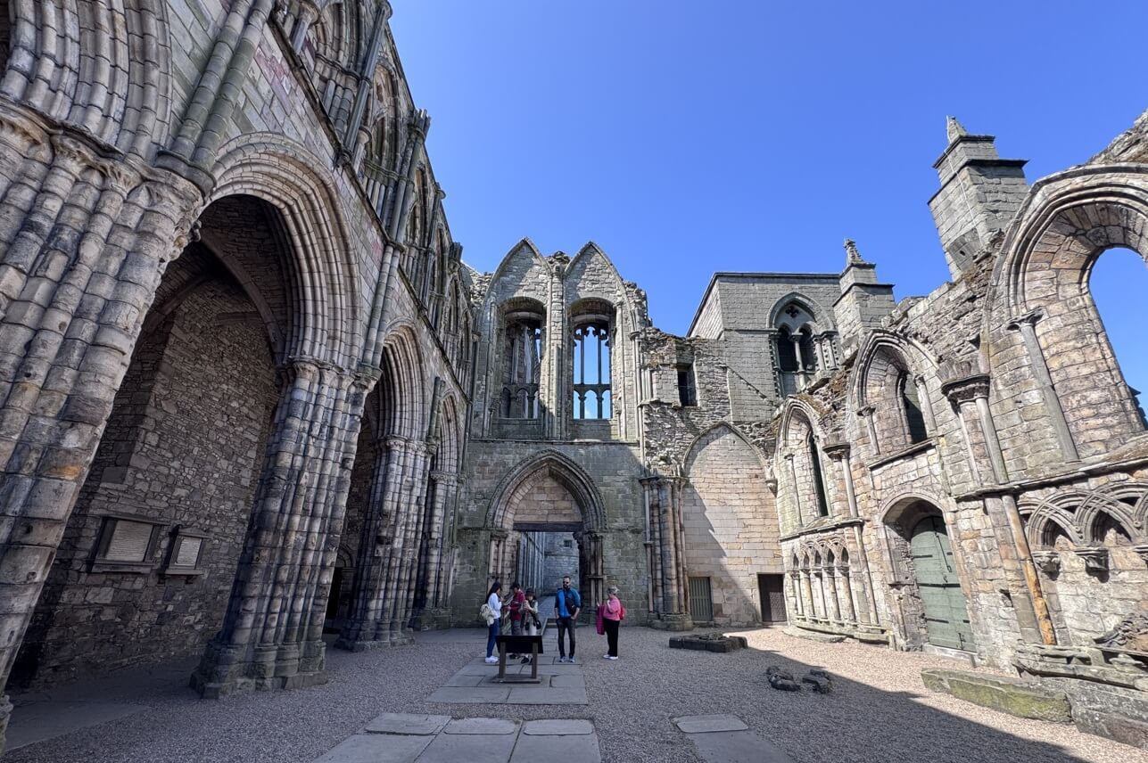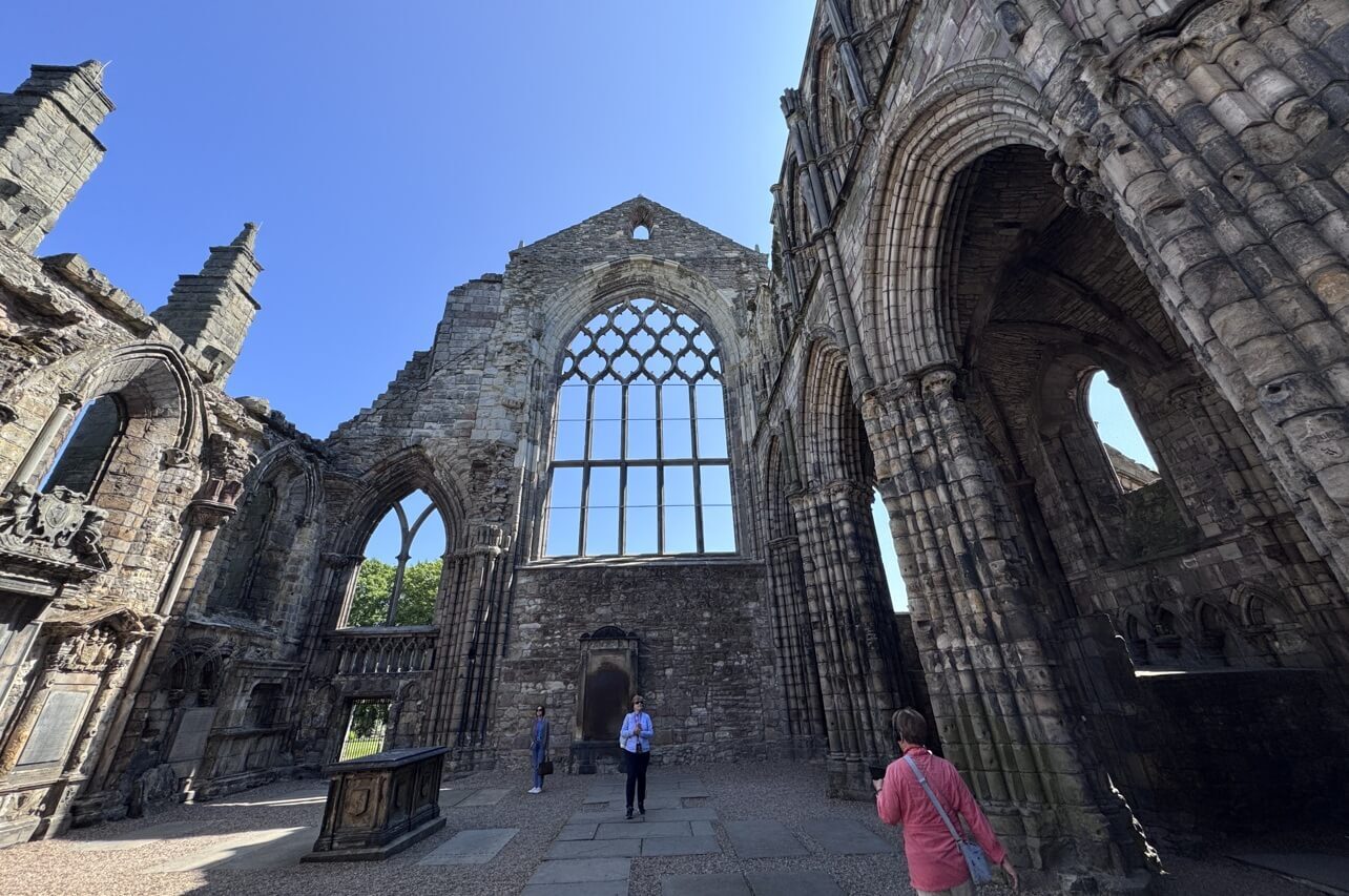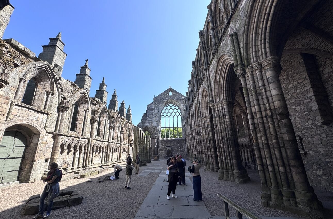 ↓Holyrood Abbey歷經擴建,於1500年時成為蘇格蘭最大的修道院之一。右圖,是我們現在所站位置的中殿,所看到的1500年時的修道院內部。