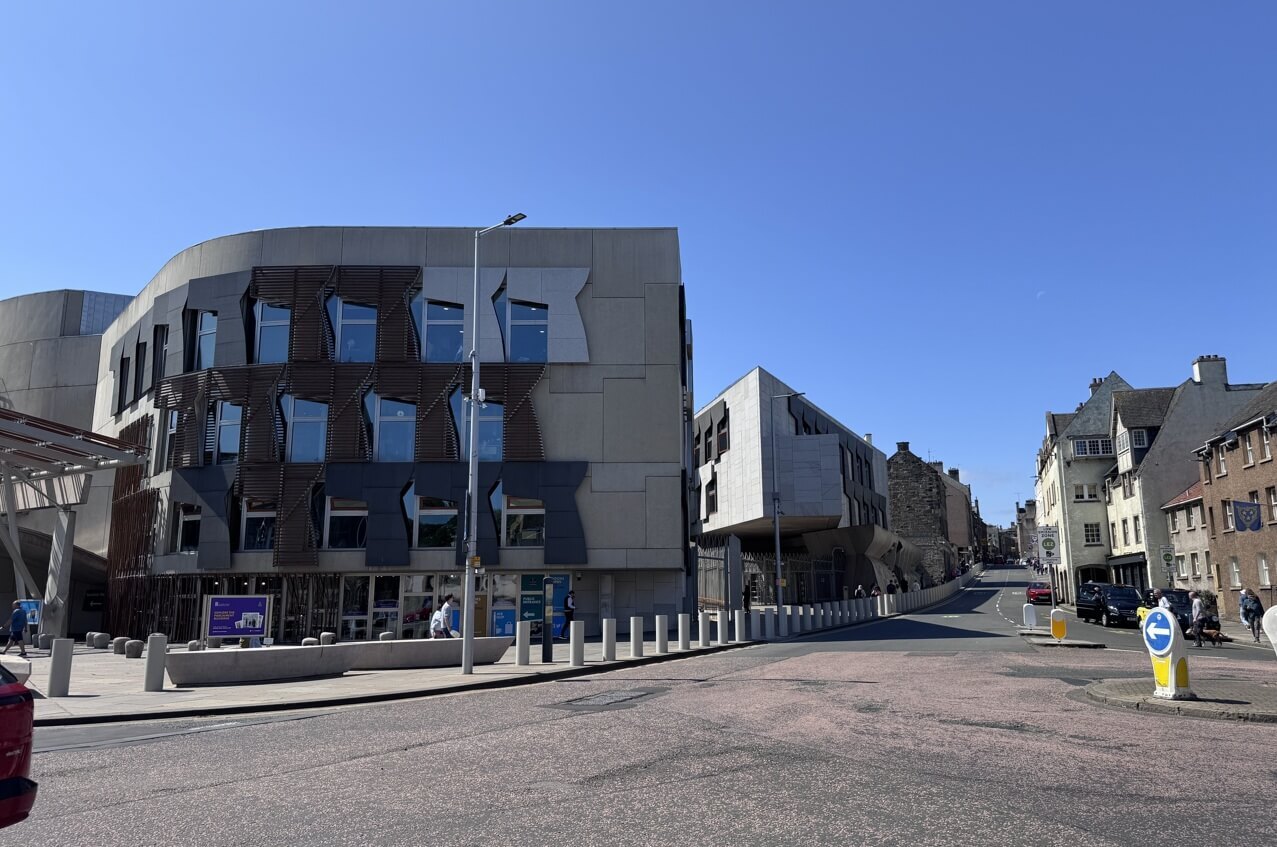 ↓Horse Wynd另一頭走到底,會到達我們下午要去參觀的「愛丁堡古堡Edinburgh Castle」,而左前方這一棟,是「蘇格蘭議會大廈Scottish Parliament Building」。