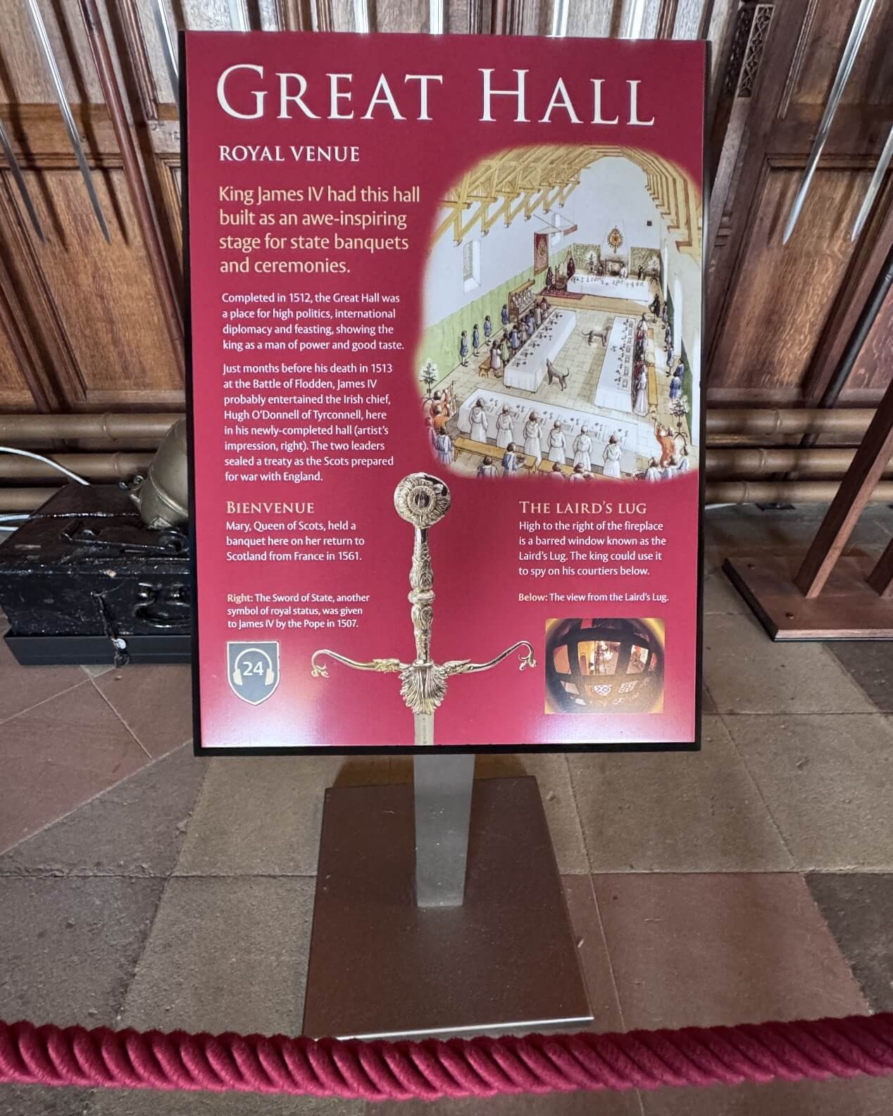 ↓大廳完工於1512年,16世紀時,曾舉辦過多場重要的會議及宴會,包含:1561年,蘇格蘭瑪麗女王從法國回到蘇格蘭,並邀請伊莉莎白女王訪問蘇格蘭時,便曾在這裡舉辦過一場宴會。