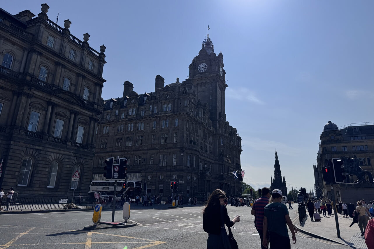 ↓接著來到愛丁堡最熱鬧的「王子街Princes Street」,前方有鐘樓的大樓,是五星級的Balmoral Hotel,稍遠處尖塔,是「史考特紀念塔Scott Monument」。