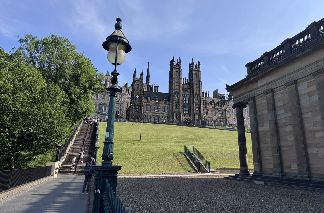 ↓蘇格蘭國家畫廊後面,是「新學院New College, The University of Edinburgh」,其前方也有大片的漂亮草地,奇怪,怎麼都沒人來這邊曬太陽?