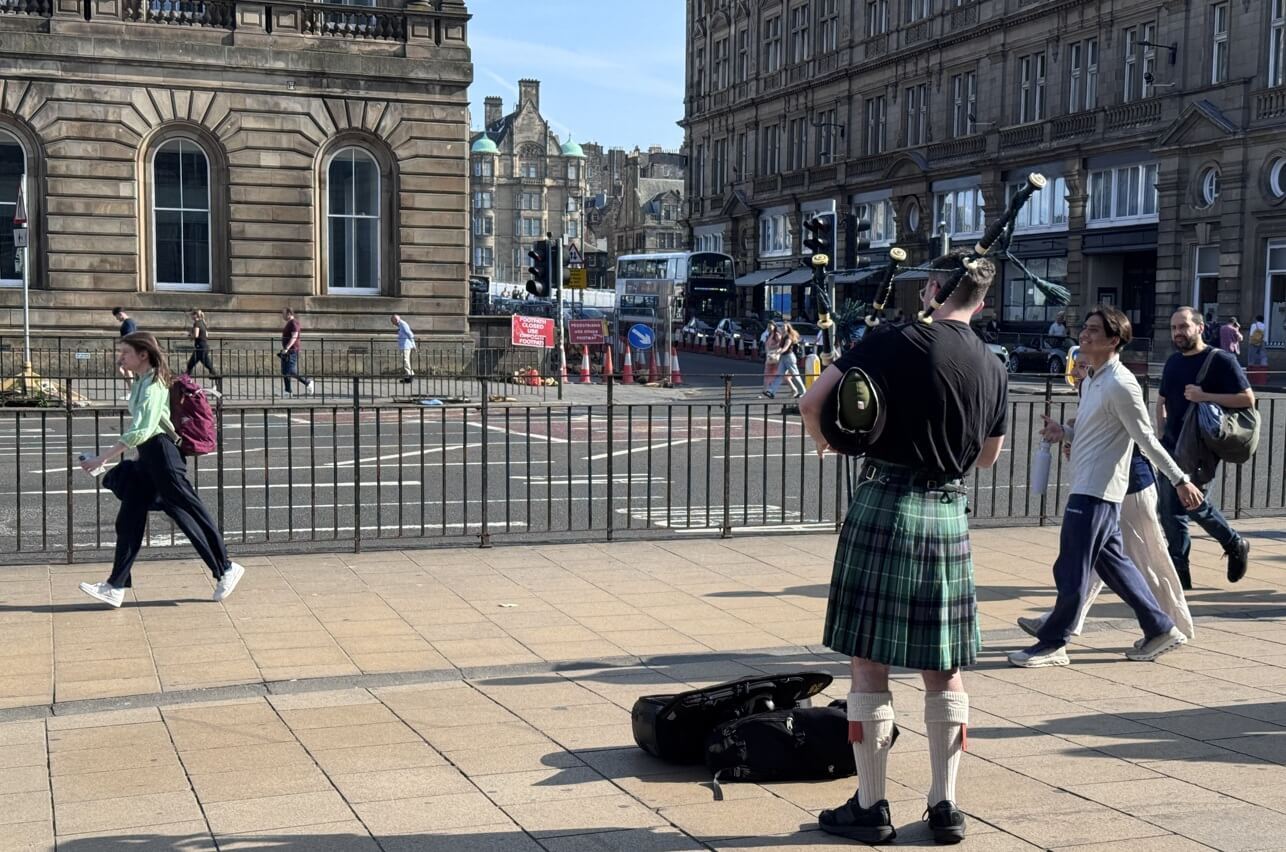 ↓王子街上穿著傳統蘇格蘭裙的街頭藝人。蘇格蘭悅耳的風笛聲,在街頭悠然地響起。