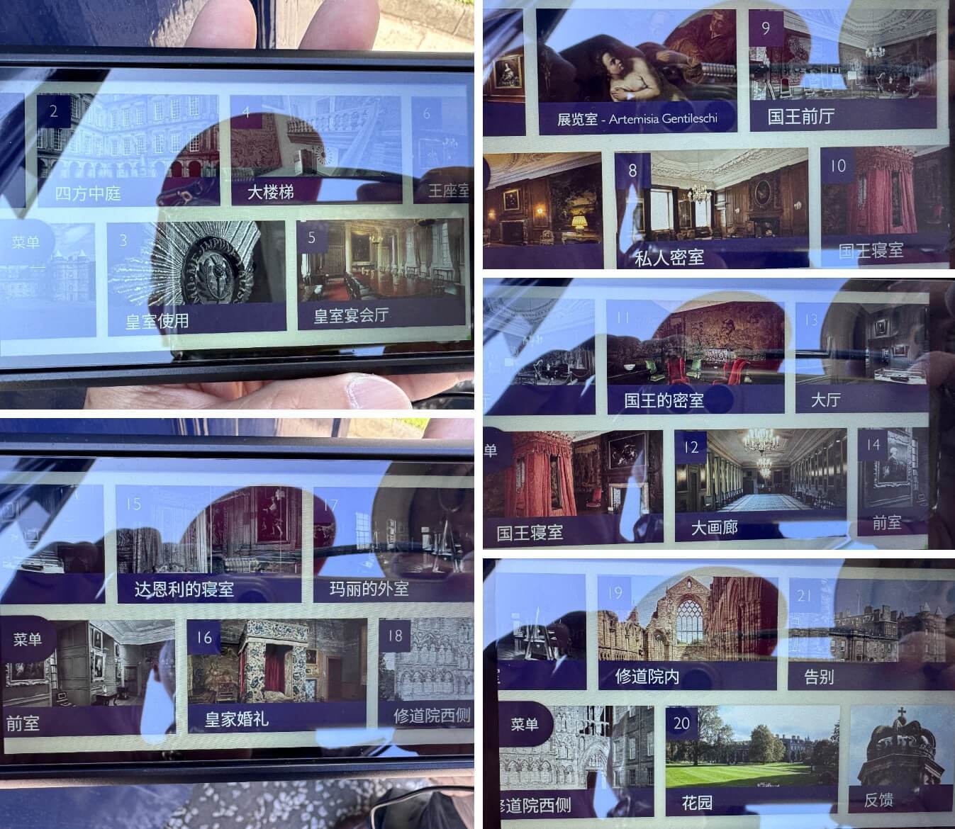 ↓皇宮富麗高貴,參觀完後,從導覽機翻拍導覽的主題。伊莉莎白二世過世後,其遺體曾短暫安置於王座室;而蘇格蘭瑪麗女王則曾在其臥室外,目睹其私人秘書被謀殺,身中50多刀,倒臥於地板上,至今仍留有痕跡,遊客可探尋。