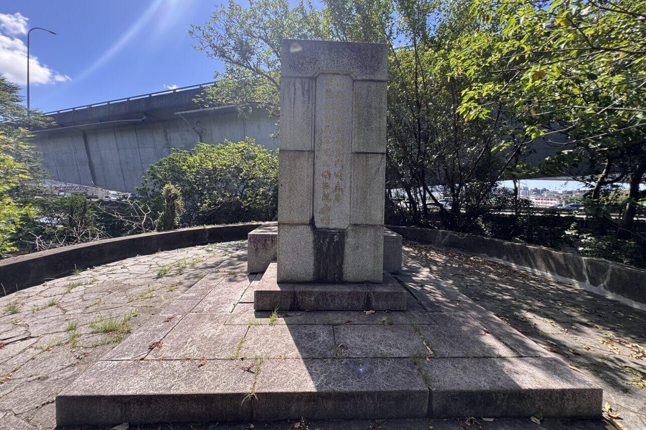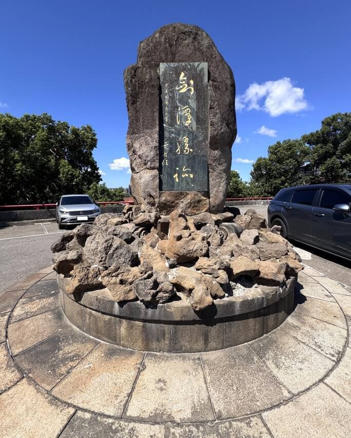 ↓石獅子的車道旁,有一座由黨國大老于右任題字的「劍潭勝跡」石碑。不過,題字是後來加上去的,原石碑是昭和4年(1929年)由「臺北紙文具商」奉獻給台灣神社的「獻兵器記念碑」,基座則為「日本海戰捷紀念碑」的台座。
