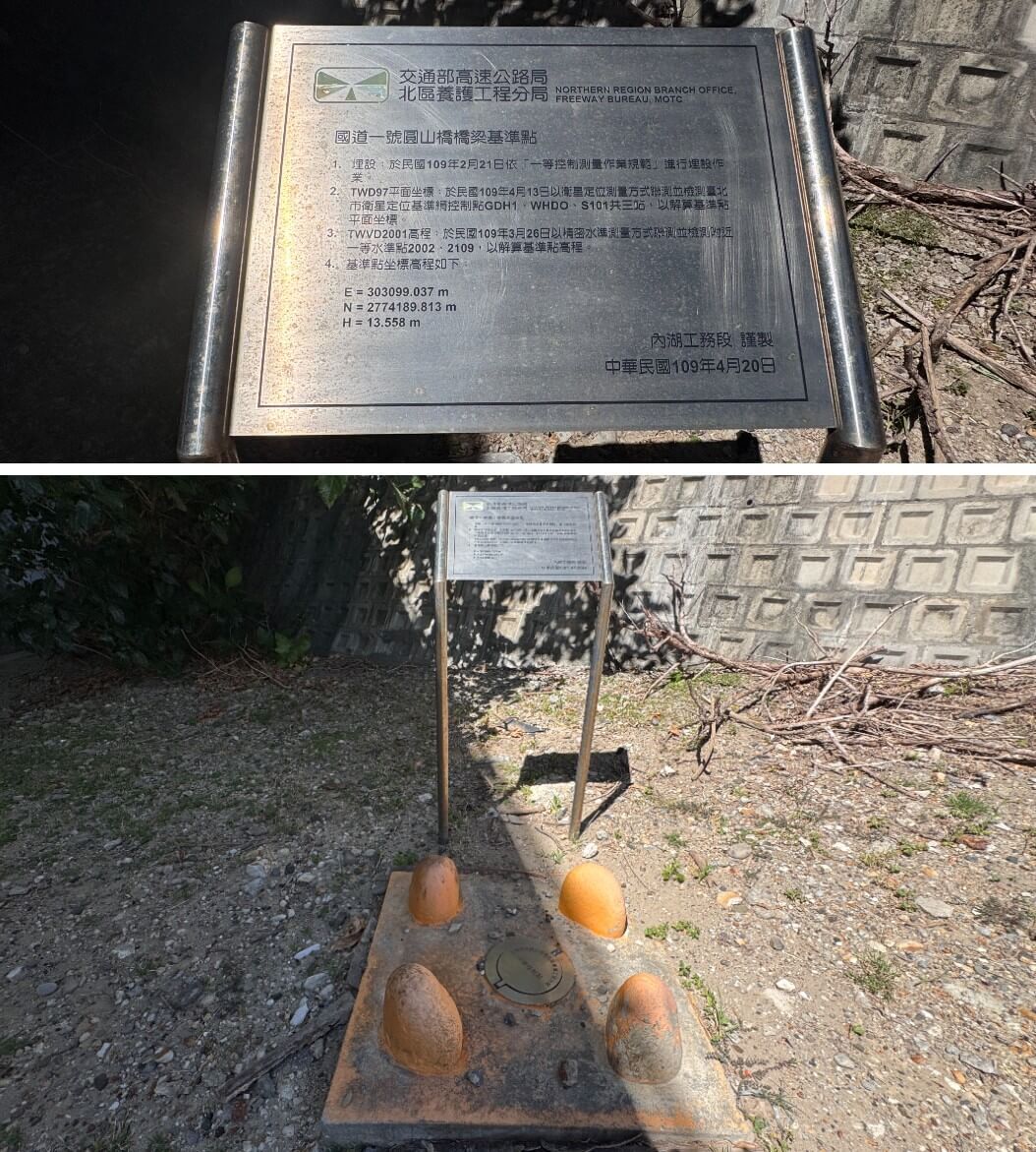 ↓牌坊旁,有一座「國道一號高速公路圓山橋橋樑基準點」,旁邊(上面)就是跨基隆河的【國1】。