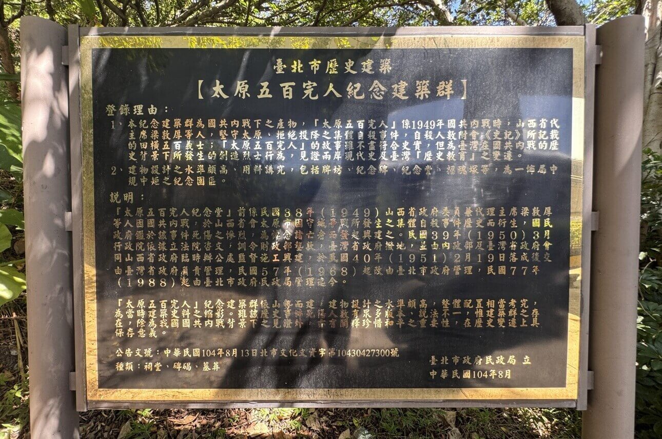 ↓回頭來看「太原五百完人」的故事。1949年國共內戰時,山西省代主席梁敦厚因堅守太原,拒絕投降,而率全家及部屬集體自殺,共計五百人。國民政府遷台後,歌頌其為「太原五百完人」,而建此建築群,目前已被列為歷史建築。