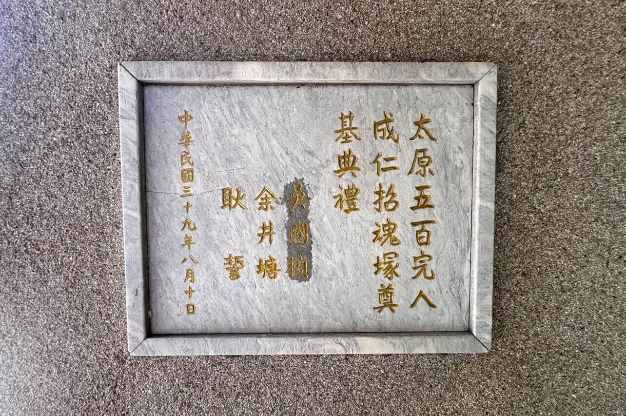↓紀念堂的側面,有民國39年(1950年)太原五百完人成仁招魂塚的奠基典禮紀念石牌,石牌上署名的吳國楨,時任台灣省主席,過去也曾與蔣氏父子多有衝突,而不容於當局,石牌上的署名有曾遭塗抹後又重新漆上的痕跡。