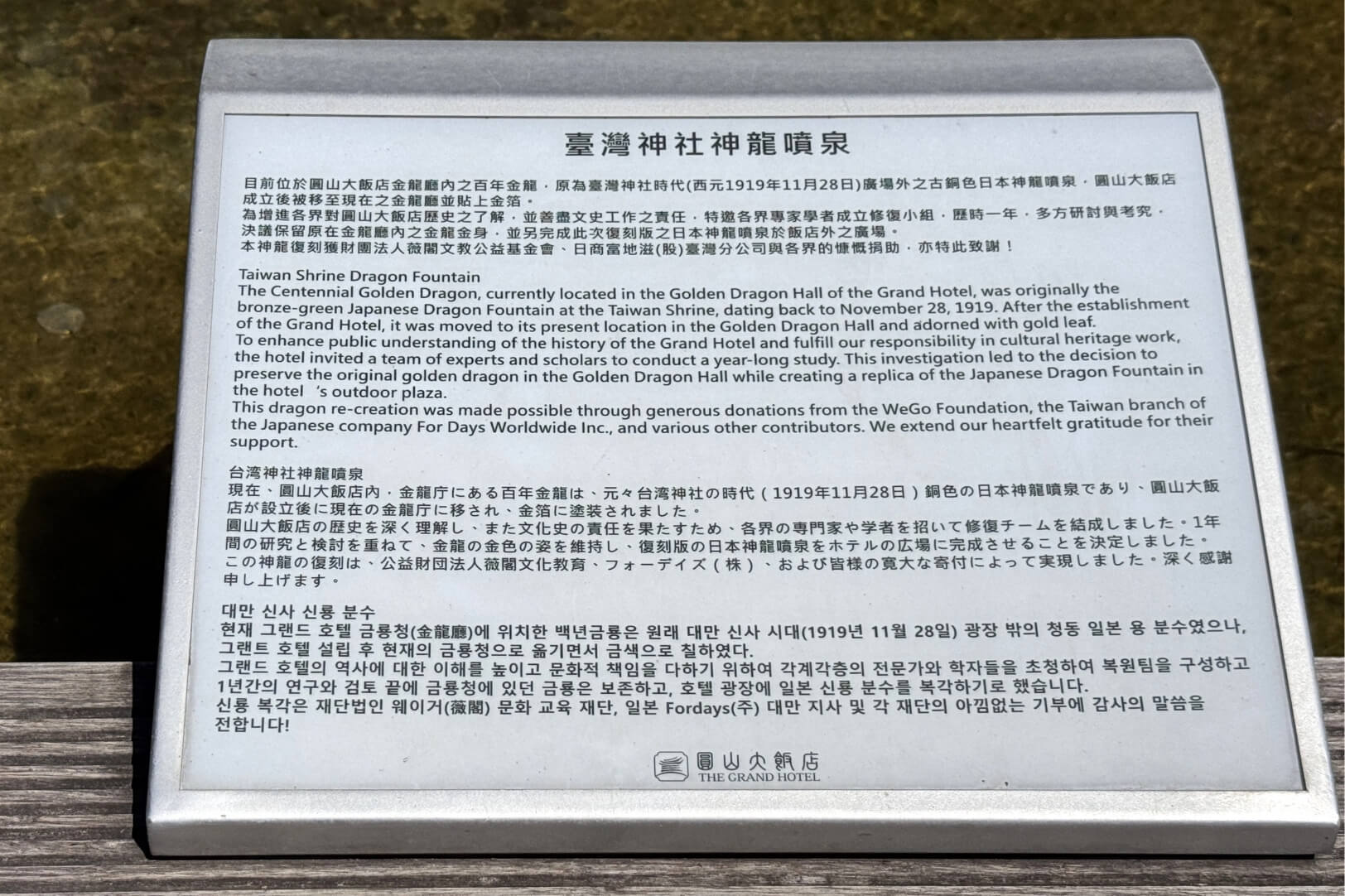 ↓日本時代的台灣神社,於廣場外有一座古銅色的「日本神龍噴泉」,是一座百年神龍,不過並不是眼前這一座;這一座是圓山大飯店復刻擺設於此的,而原神社的神龍噴泉,則被保存於飯店內的「金龍廳」。