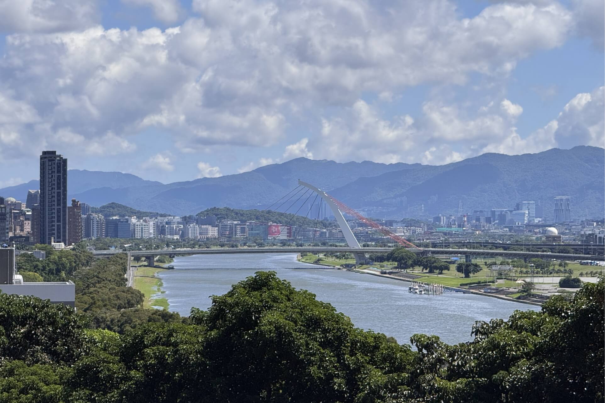 ↓圓山大飯店東臨基隆河,因地勢高而可俯瞰基隆河,前方橋樑為辨識度極高的「大直橋」,外觀狀似一把釣竿垂釣基隆河、撐起橋面。
