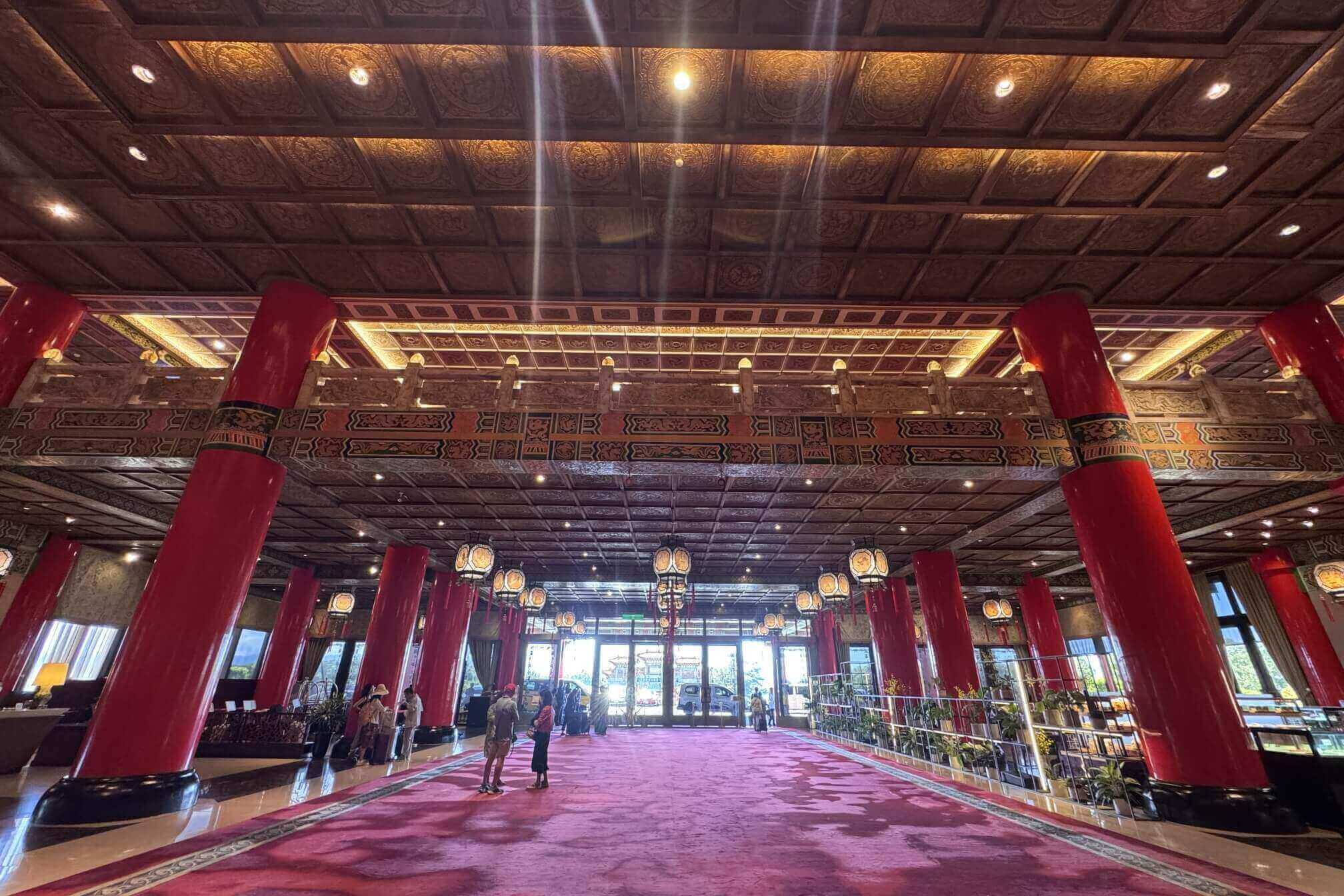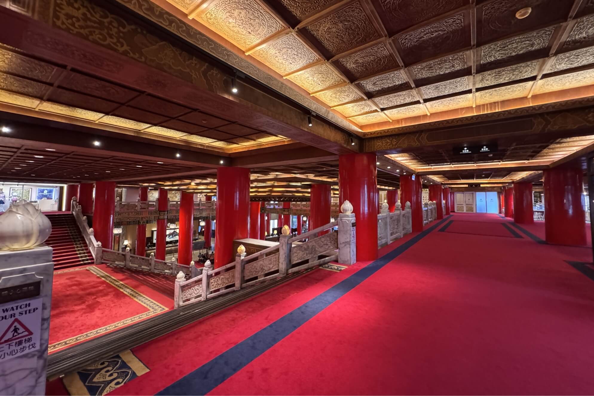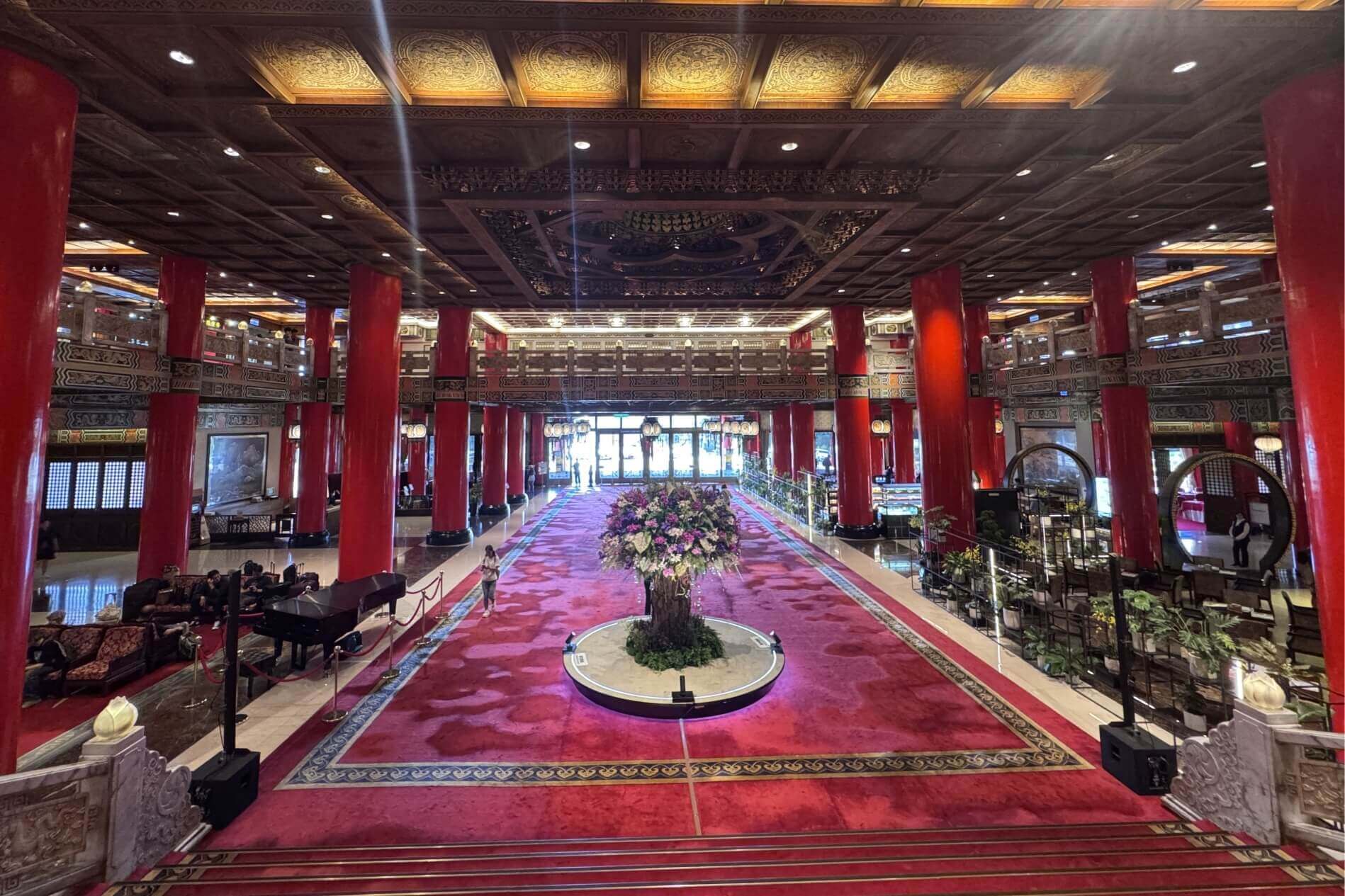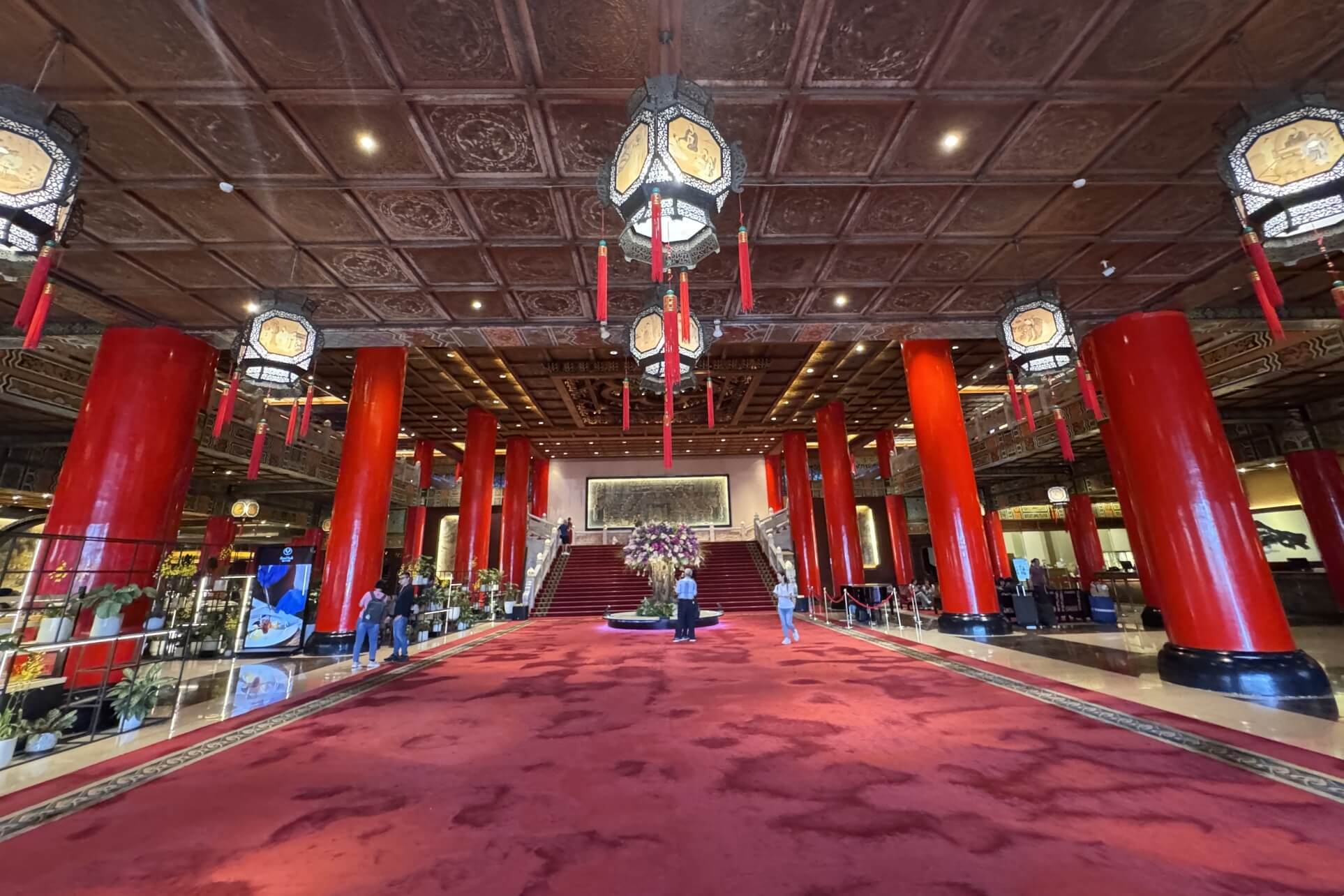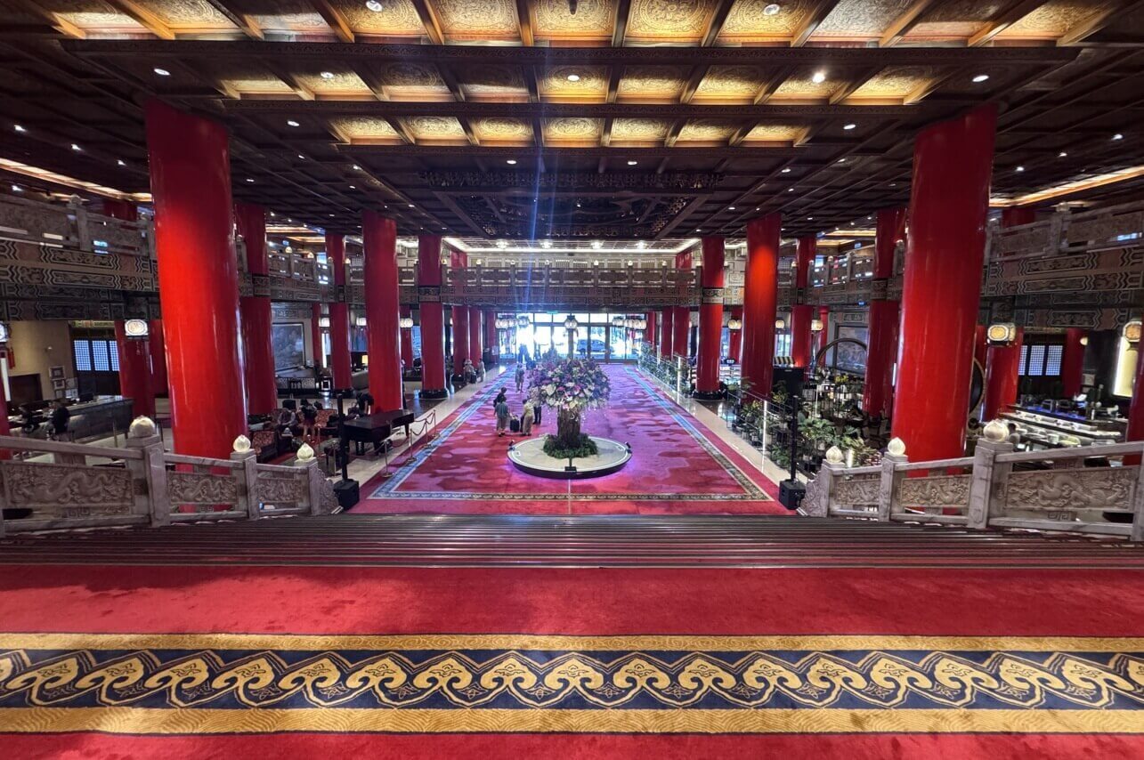 ↓進到飯店內的大廳,滿滿的中式建築意象,彰顯富貴吉祥的紅色地毯、高懸的宮燈、朱紅大圓柱、雕龍天花板…。