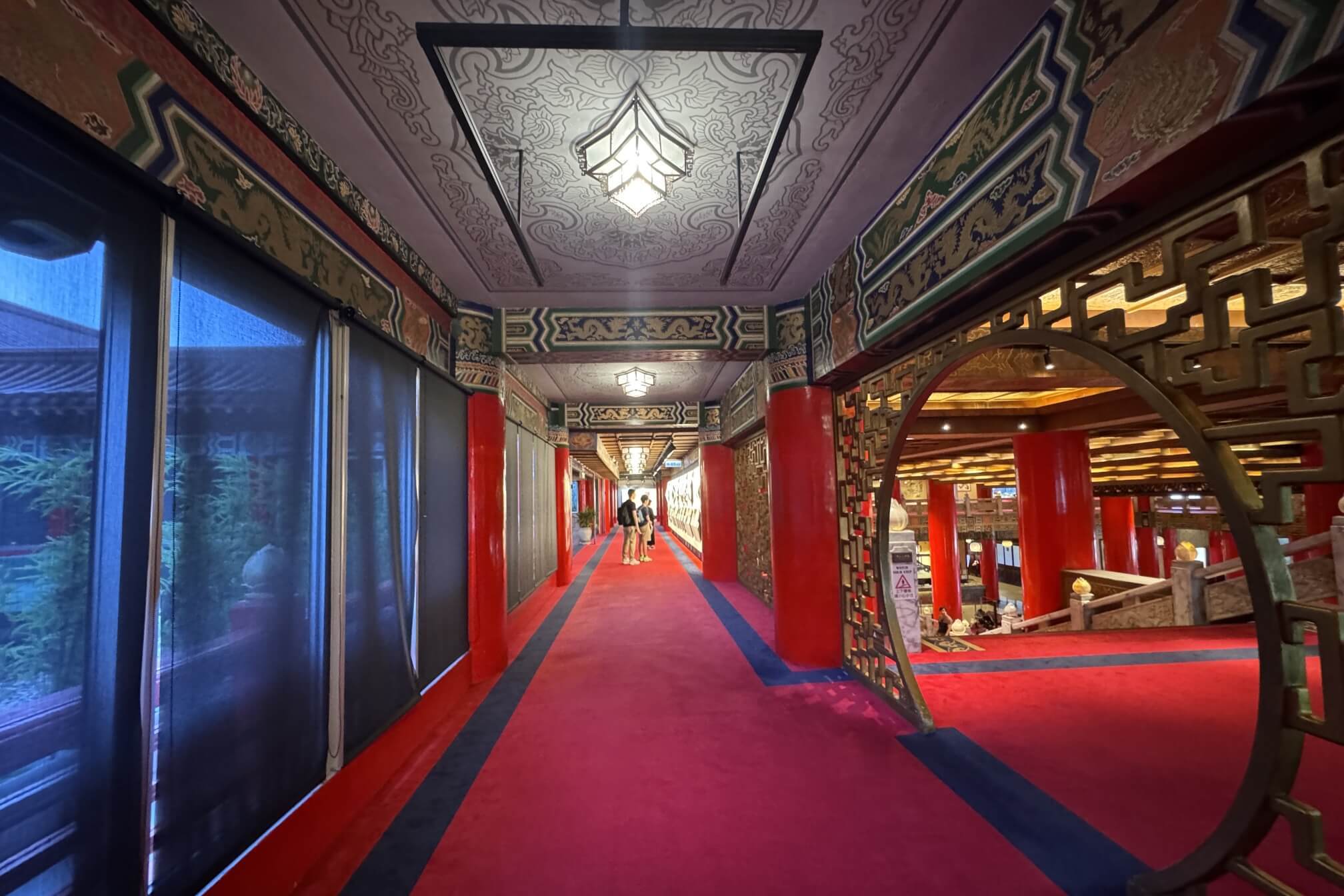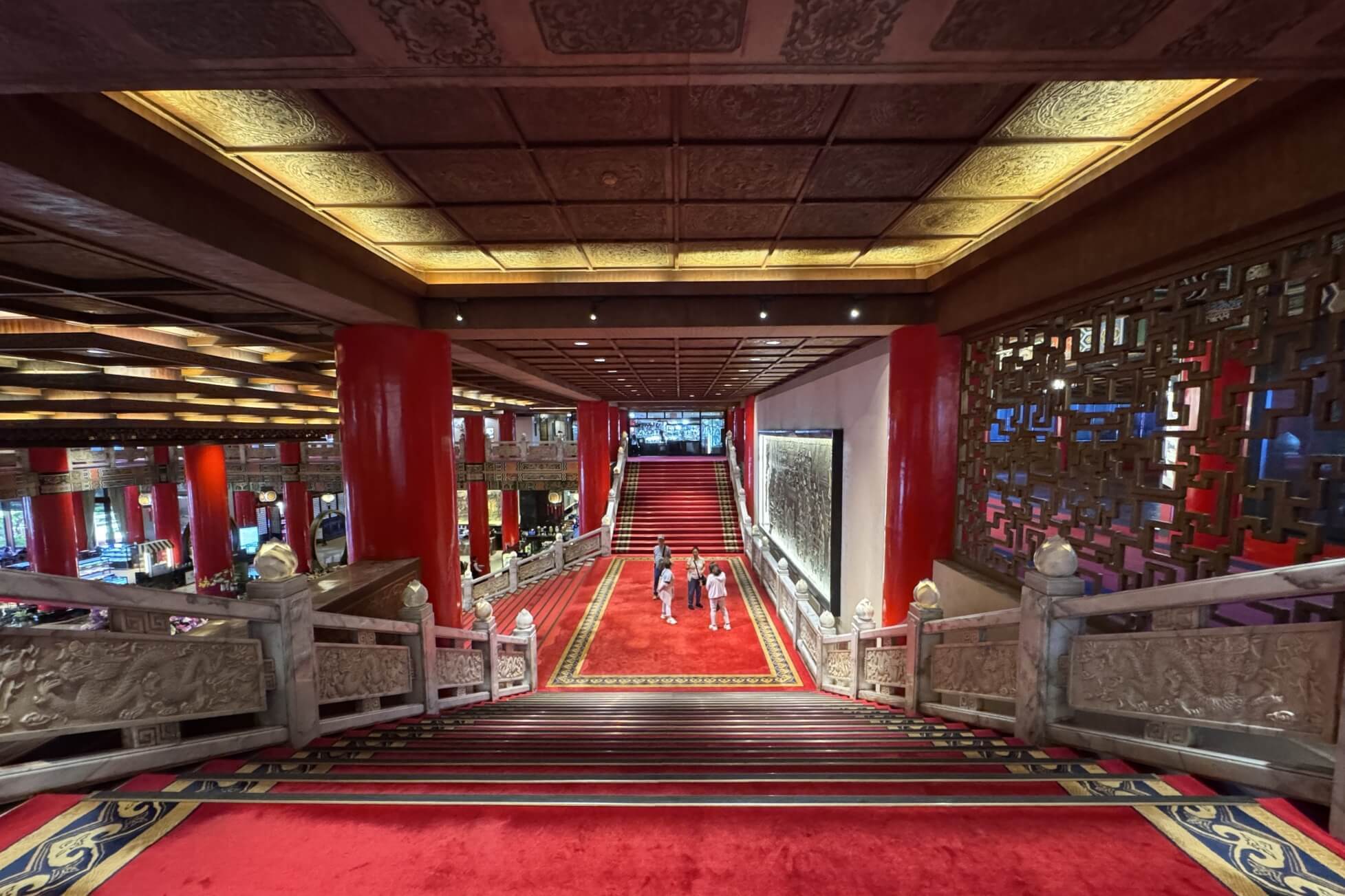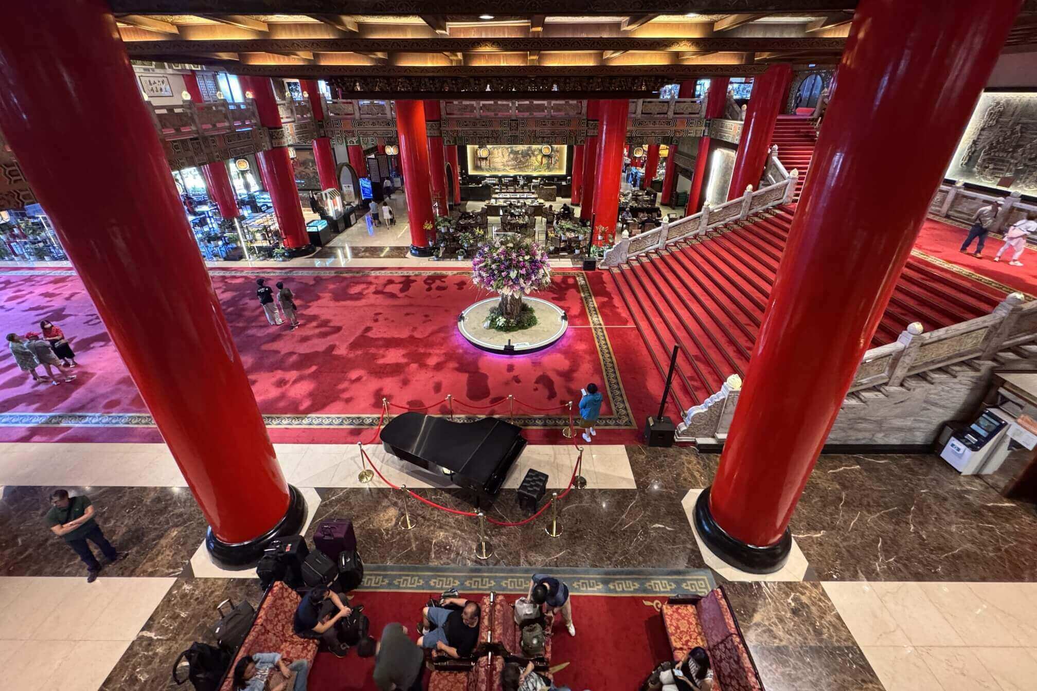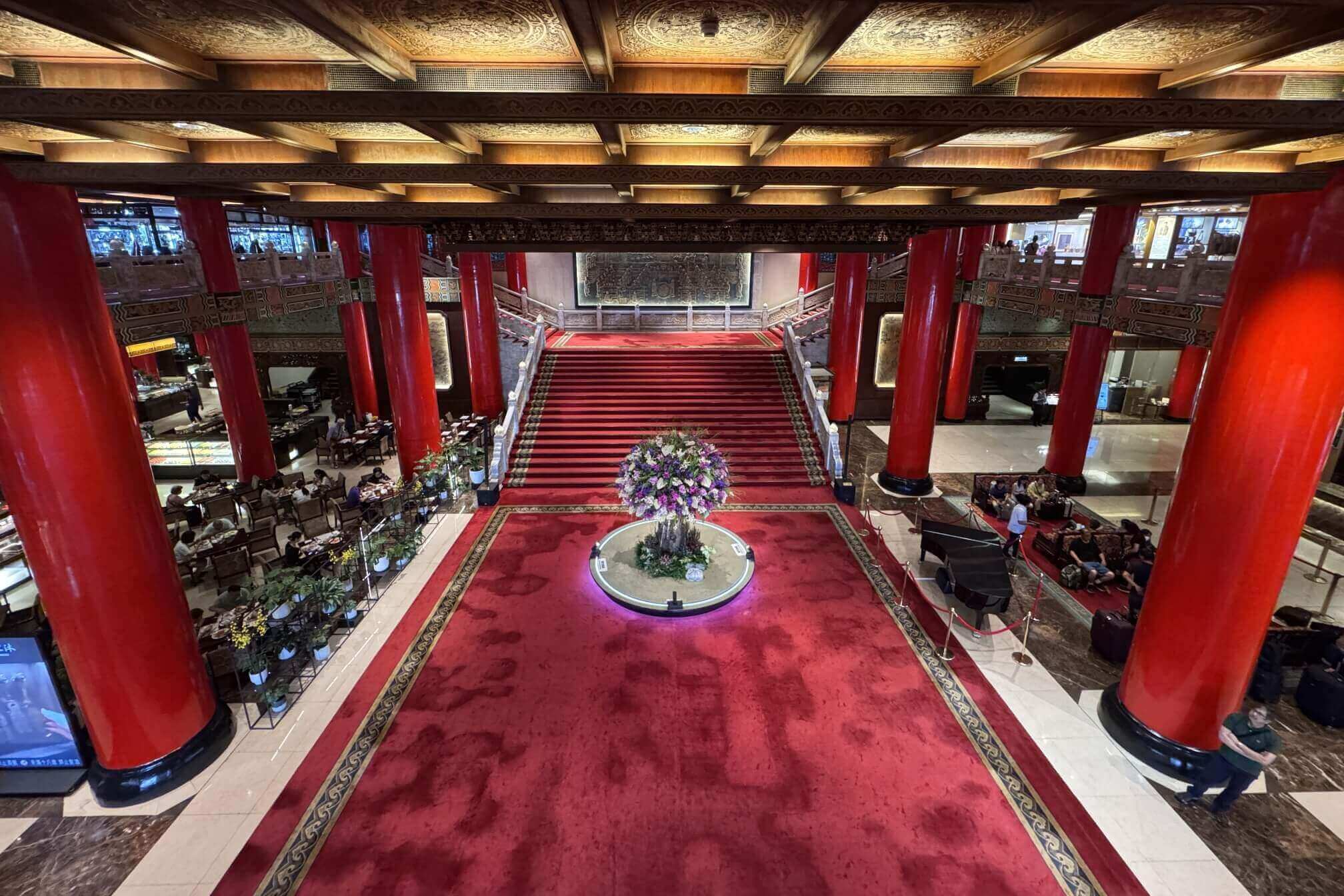 ↓進到飯店內的大廳,滿滿的中式建築意象,彰顯富貴吉祥的紅色地毯、高懸的宮燈、朱紅大圓柱、雕龍天花板…。