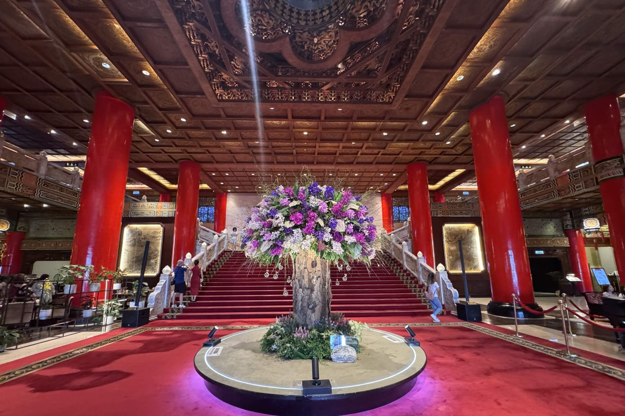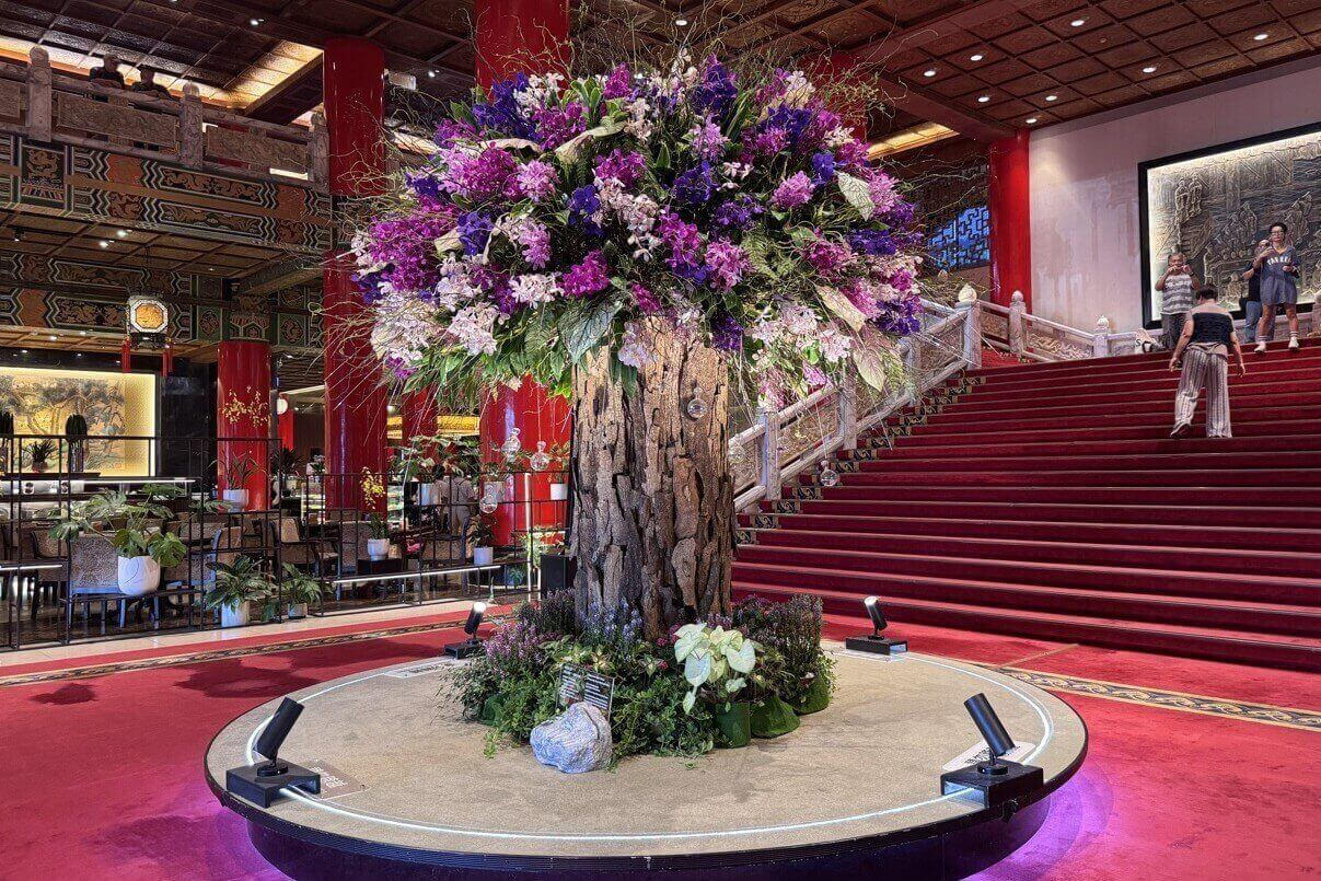 ↓大廳在梅花藻井天花板下,有一棵開滿彩虹花瓣的樹。
