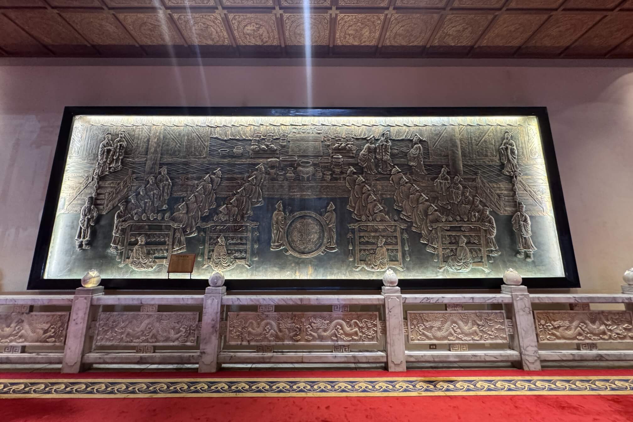 ↓階梯上的中央牆面上,有一幅大型的「周公制禮作樂」銅雕,呈現了宏大的宮廷場景,象徵著中華文化的博大精深以及禮儀制度的莊重典雅,呈現宏偉莊嚴的宮廷氣勢,足可讓賓客感受到東方皇室般的隆重與氣派。