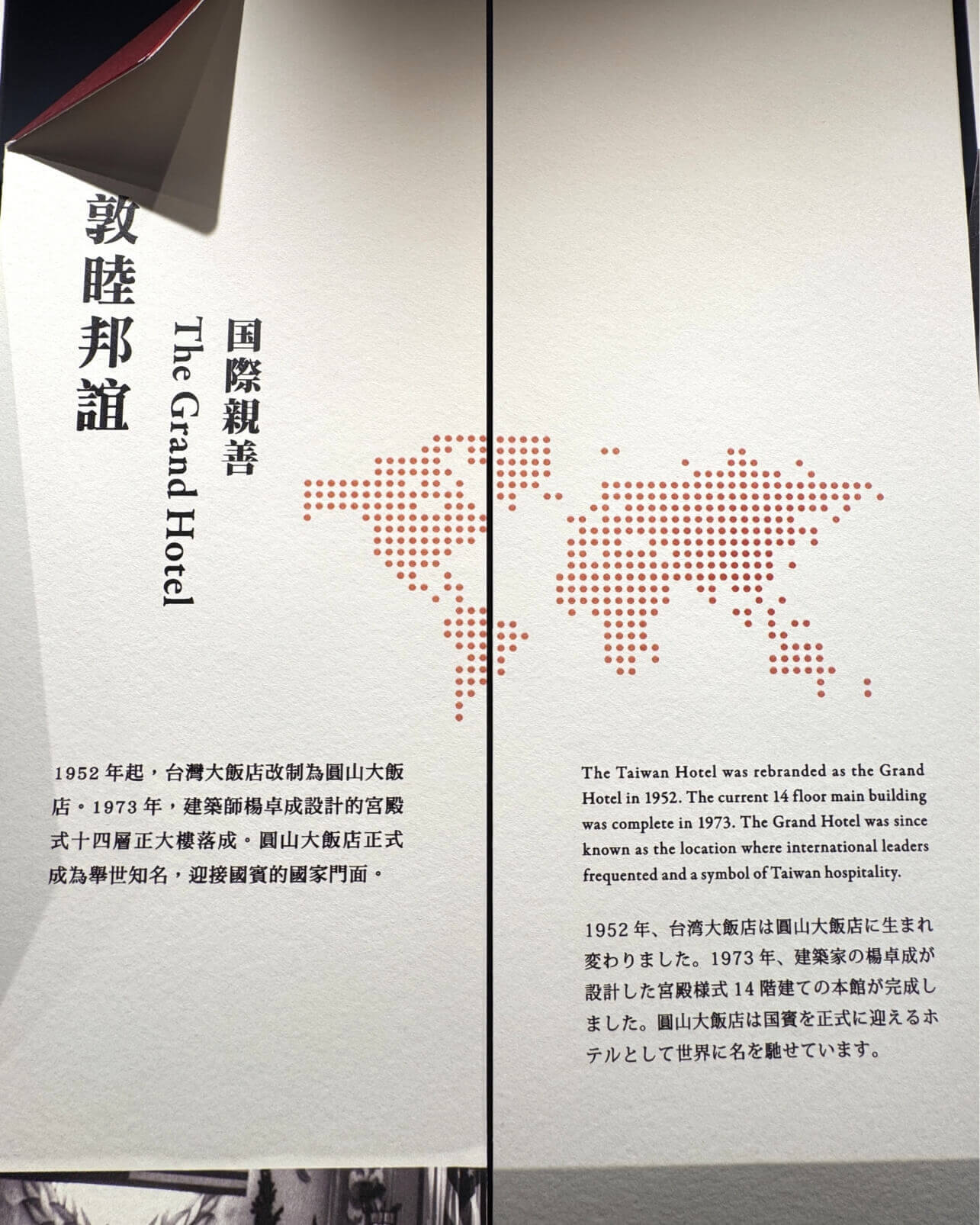 ↓1952年,台灣大飯店改制為圓山大飯店,成為蔣氏家族的御用飯店;1973年,全新的宮殿式建築落成,成為國際知名飯店,曾被選為【全球十大飯店】之一,也是我國招待國賓、貴客的重要飯店。