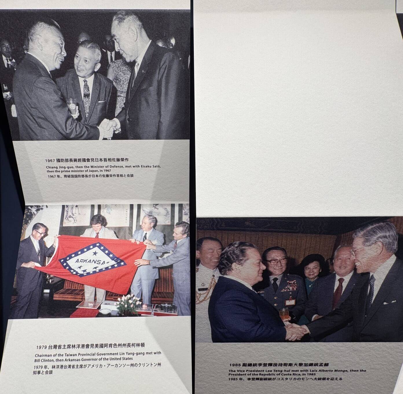 ↓1967年,時任國防部長的蔣經國與日本首相佐藤榮作會面;1979年,還是阿肯色州州長的柯林頓來訪;1985年,還是邦交國的哥斯大黎加總統孟赫來訪。