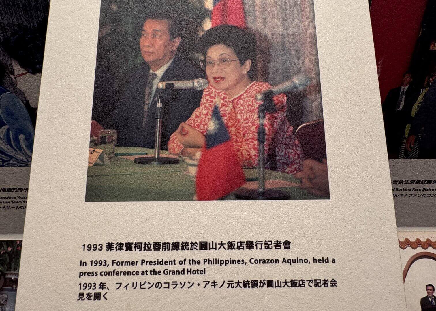 ↓同(1993)年,菲律賓前總統柯拉蓉也曾在圓山大飯店舉行記者會。實在很令人感慨,我國曾與世界接軌,許多國際友人都曾不遠千里而來,近年來已不多見。