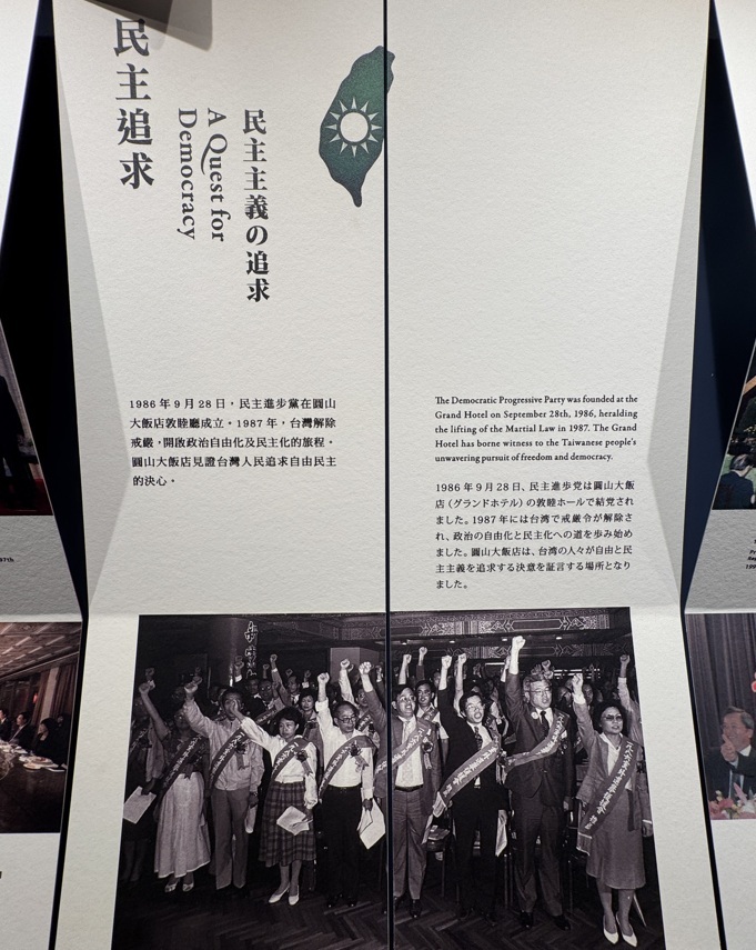 ↓圓山大飯店也曾扮演見證我國民主轉型的重要舞台。1986年,民主進步黨在圓山大飯店成立,開啟我國兩黨政治及後來的多黨政治的大門。