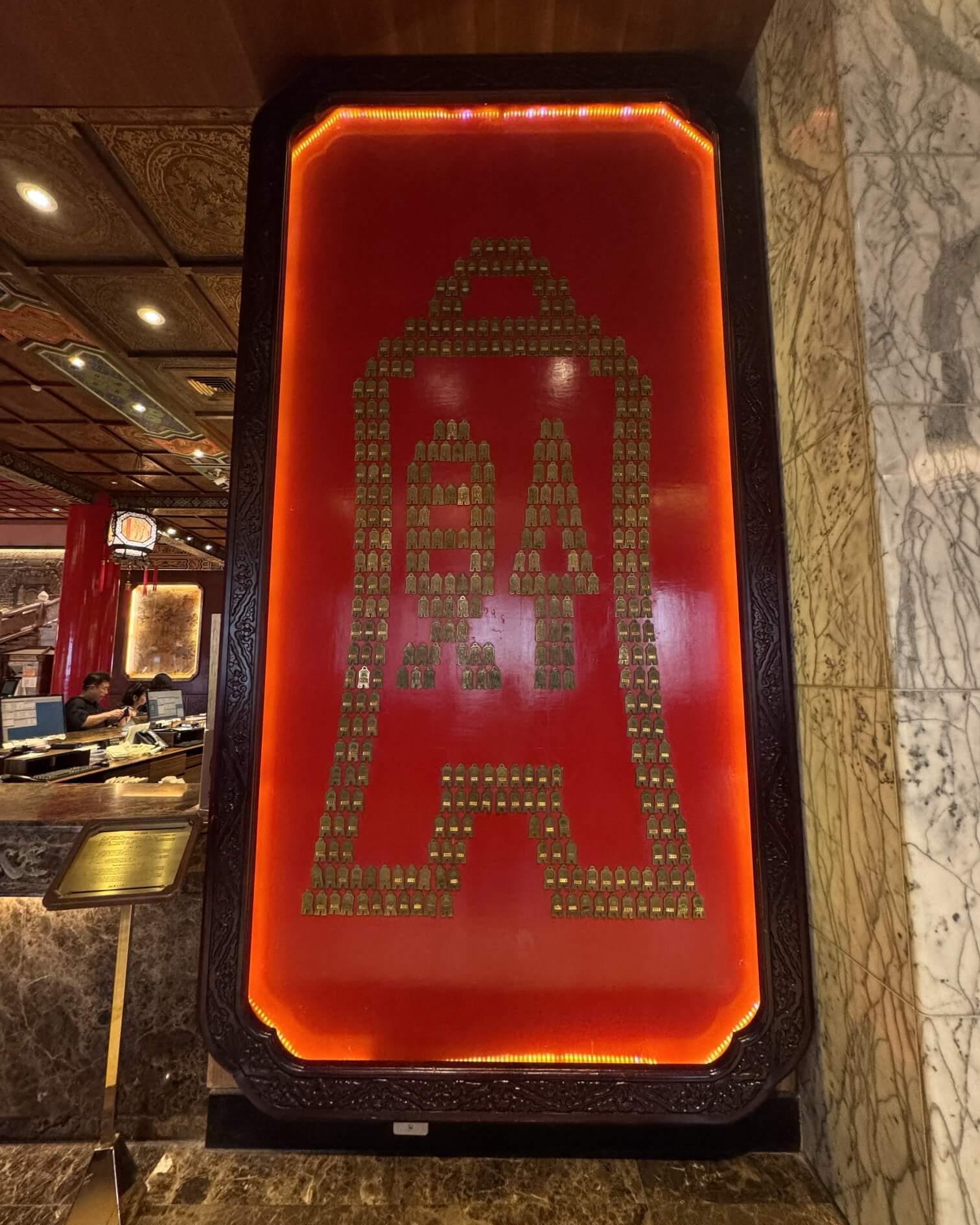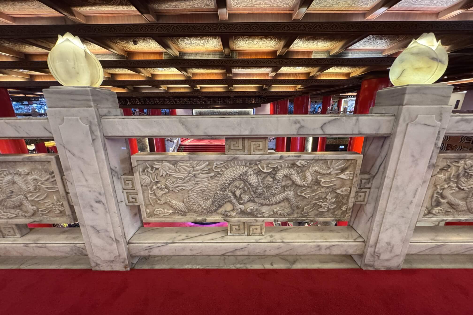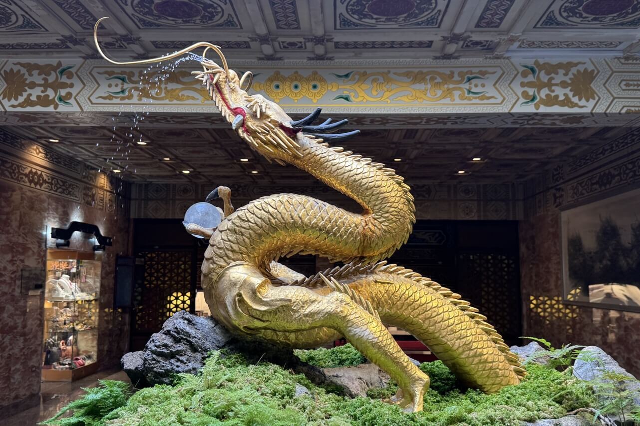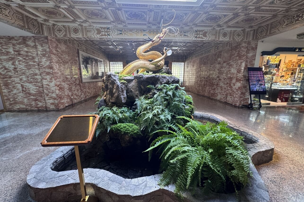 ↓神龍於2023年曾因天井掉落敲擊而受損,飯店決定還原歷史,復刻神龍原貌後,重新呈現於世人眼前。從這個角度,可以看出頸部修復過的痕跡。