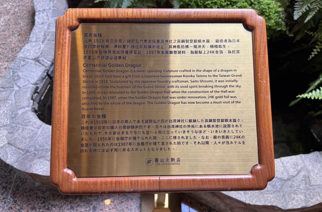 ↓這是1919年日本商人館野弘六奉獻給台灣神社的黃銅製登龍噴水器,原置於神社外苑噴水池上。1956年金龍廳落成時遷置於此;1987年,金龍廳整建時,為龍貼上24K金箔,成為來圓山大飯店的必遊景點。