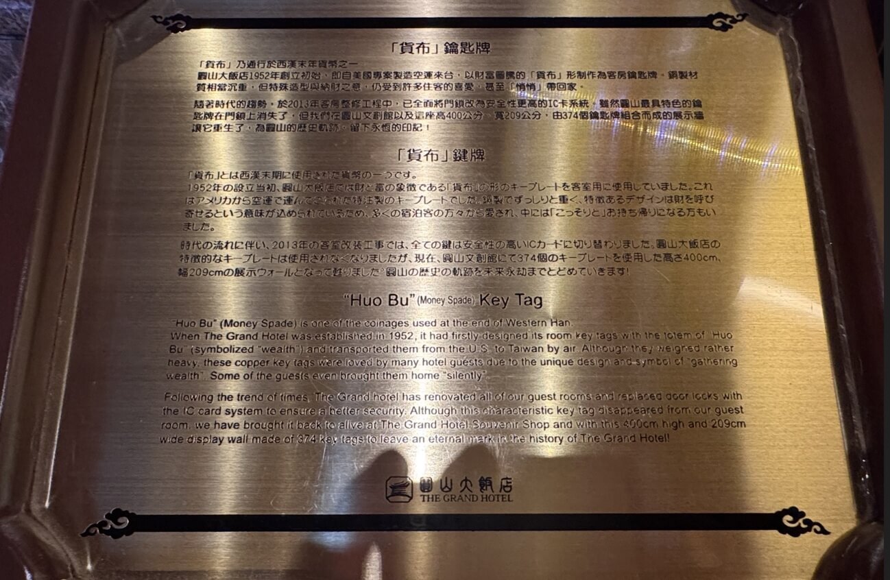 ↓隨著時代的演進,2013年客房整修時,改為IC門禁卡,貨布鑰匙功成身退,而改製為這面高400公分、寬209公分,以374支貨布鑰匙組合而成的圖案,為圓山的歷史軌跡,留下了永恆的印記。