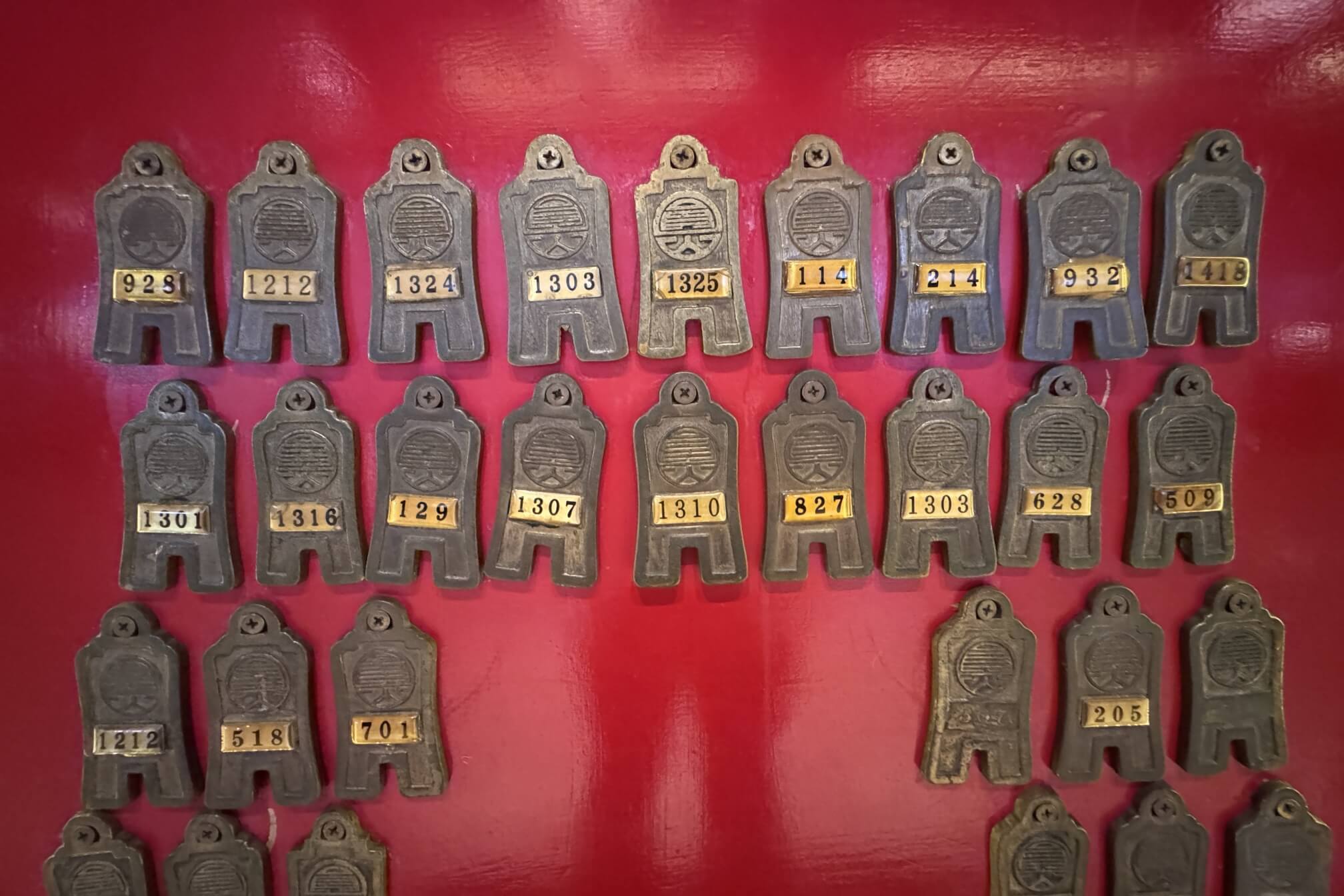 ↓「貨布」是通行於西漢末年的貨幣之一。圓山大飯店於1952年創立時,即從美國引進財富圖騰的貨布形制,作為客房的鑰匙牌,因造型特殊及財富意涵,深受房客的喜愛。