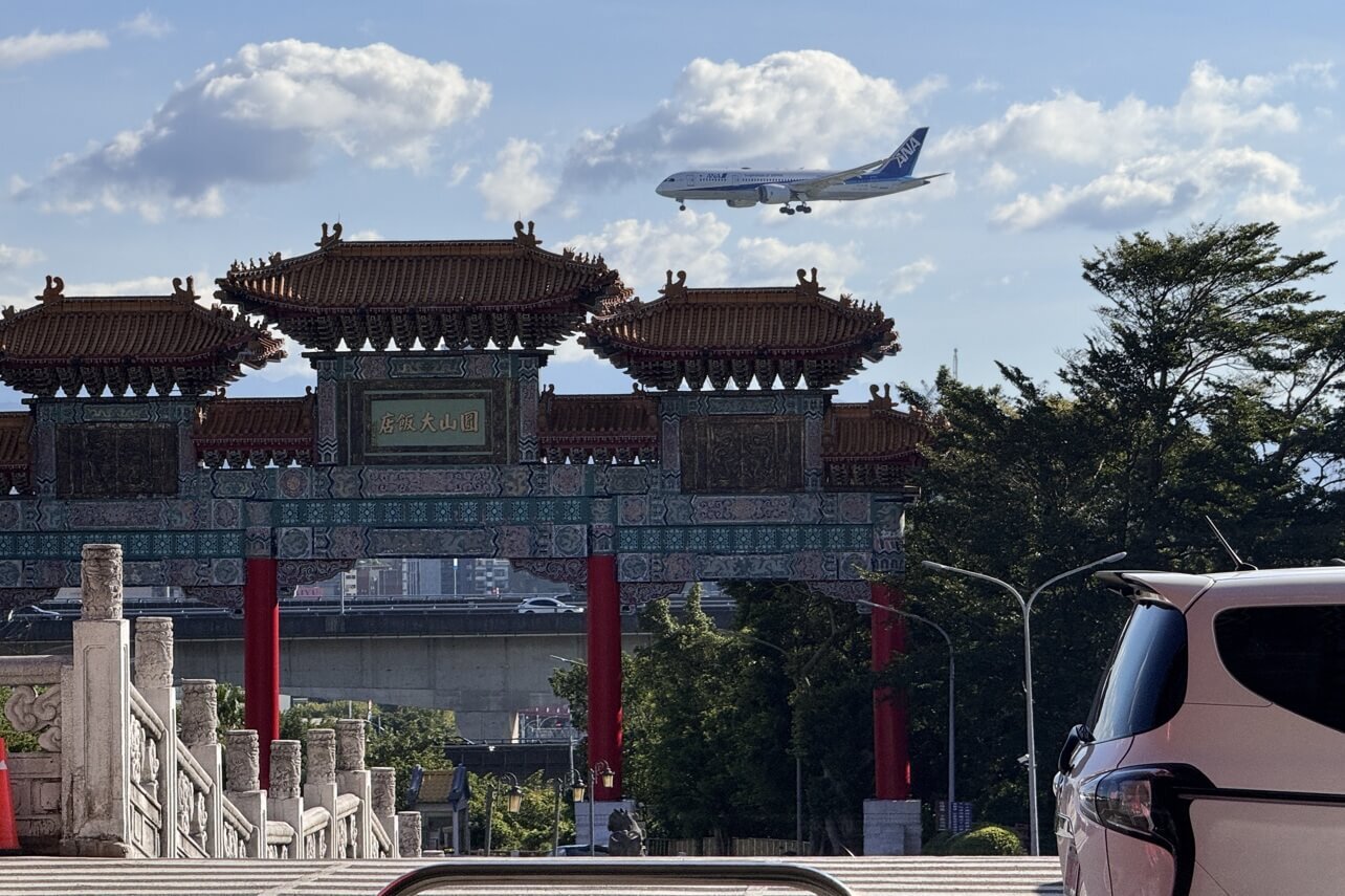 ↓松山機場就在離圓山大飯店不遠處,常可見到飛機從牌樓上方飛過去的景象。