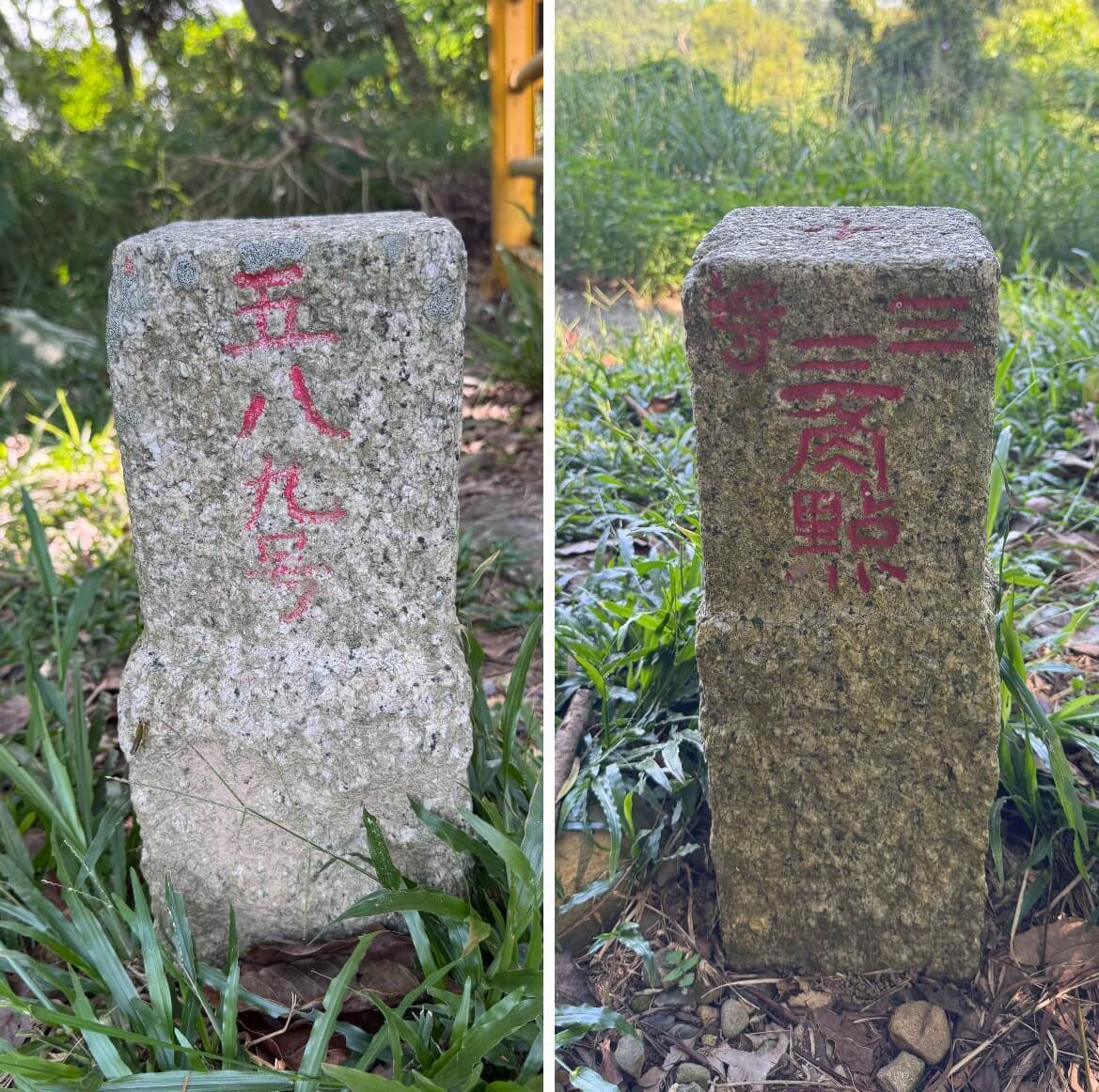 ↓石燈籠基座兩兩相對、立於參道兩旁,多在樹叢中,稍不注意即可能錯過。
