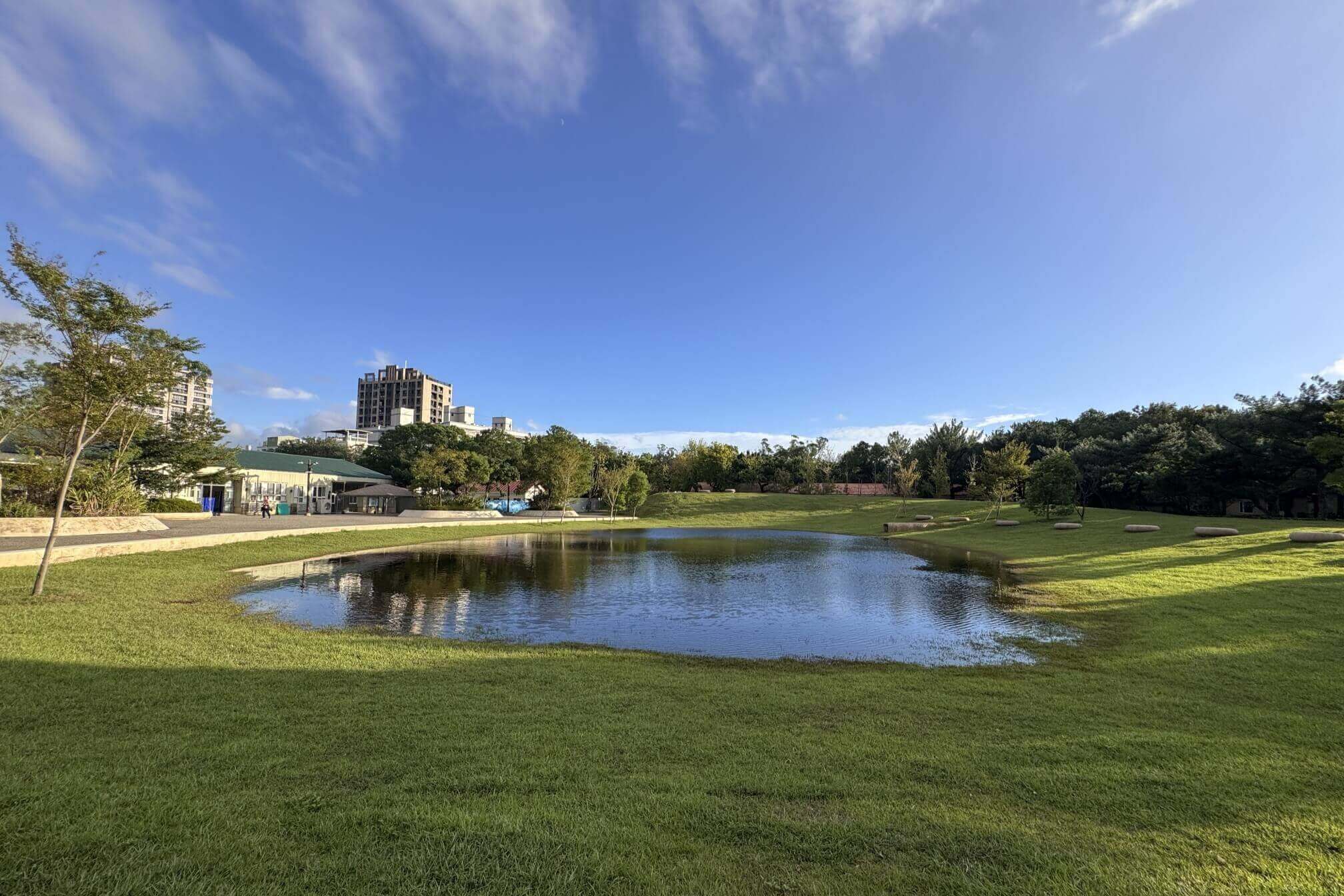↓公園裡還有另一座水池,這是一片「休憩滯洪草地」。